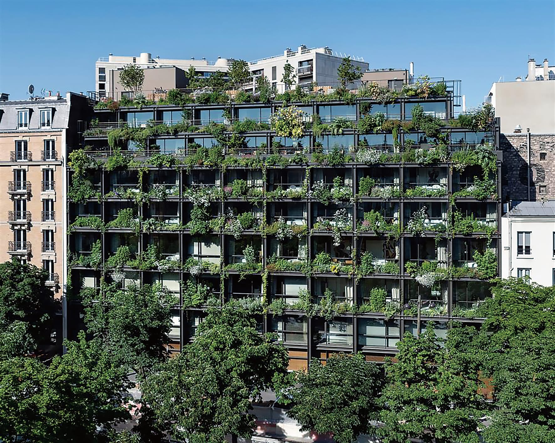 位於蒙帕納斯的VILLA M,就像城市中一片遠離繁囂的綠洲,景觀設計師PABLO GIORGEFF特別挑選長青、藥用、果樹和其他法國本地植物,種植在大樓的黑色鋼製框架、露台和外牆,形成日漸茂盛及呈現不同季節變化的垂直式花園,同時有效調節室內溫度和減少能源消耗,美觀與實用性兼備。