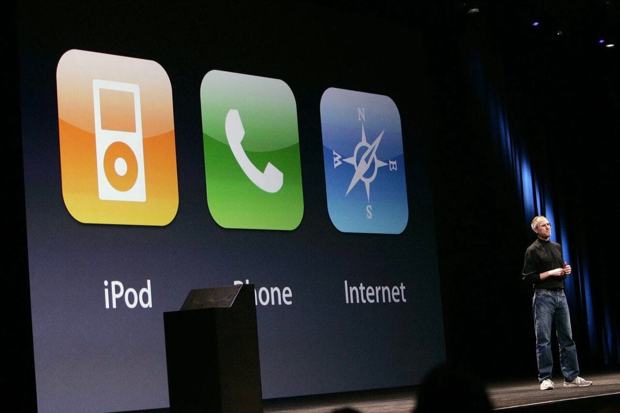 2007年,Apple以結合電話、iPod和網絡功能作賣點在Macworld上發佈第一代iPhone,STEVE JOBS會上貫徹其自信而幽默的演說風格,先來一張在iPod結合傳統電話撥的輪設計概念圖開玩笑,又表示其他電話的QWERTY實體鍵盤和觸控筆不切實際……最後以比同業走前五年的螢幕多點觸控功能震懾全場!雖然大眾在事前已預測Apple推出手提電話的舉動,但當時誰又料到,今天的Apple不但主導智能手機市場,iPhone更成為大多數人日常生活的必需品,以至對人文發展帶來翻天覆地的改變?
