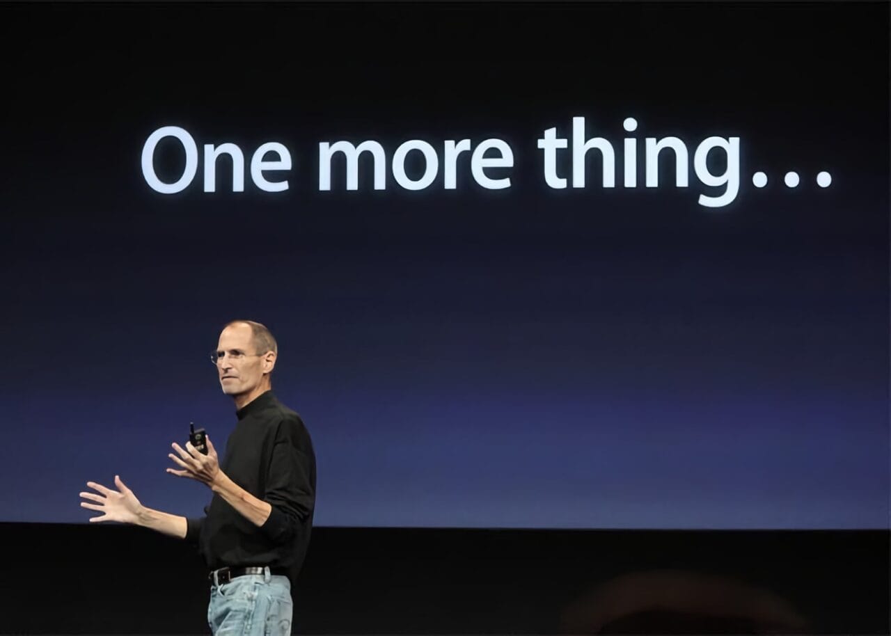 STEVE JOBS經典名言之一「ONE MORE THING」,主要在發佈會上用作介紹壓軸新產品的開場白,起初他會故作忘記及時補充,到後期已變成果迷們相當期待的必備驚喜環節,Apple Cinema Display、iMac DV、Power Mac G4 Cube、Titanium PowerBook G4、iPod shuffle、MacBook Pro、Apple TV(當時稱為iTV)、Windows版本Safari、MacBook Air,以及iPhone 4的FaceTime功能等,均是以這個形式呈現在觀眾眼前,直至STEVE JOBS於2011年離世後,Apple CEO繼任人TIM COOK仍有一段時間以此方式發表Apple Watch、Apple Music和iPhone X產品等。時至今天,「ONE MORE THING」已取替了無新意的「LAST BUT NOT LEAST」,更成為重頭戲所在和引發受眾注意的代名詞。