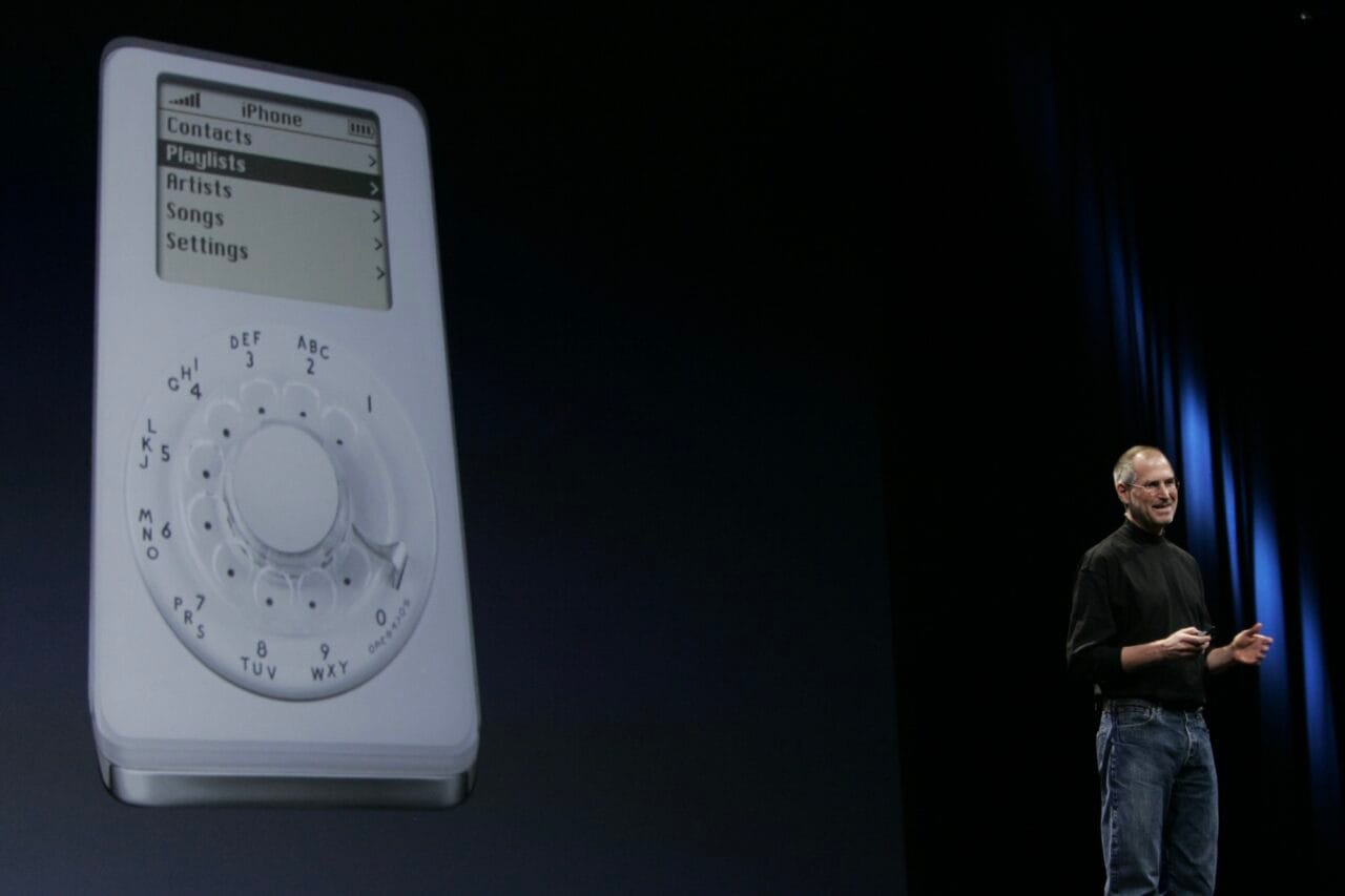 根據STEVE JOBS的官方自傳記述,Apple最初考慮以iPod作為基礎開發智能手機iPhone,並打算加上Click wheel操控各種功能,一款最為近似的產品便是俗稱iPhone零號機的ROKR E1;當然,iPhone最後採用了當時比其他同類產品先進五年的螢幕多點觸控(MULTI-TOUCH)技術,但STEVE JOBS在發佈會上不忘拿出概念圖來開玩笑。