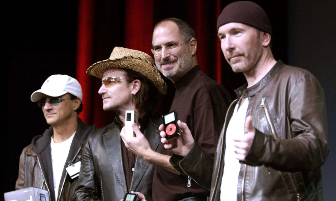 殿堂級樂隊U2與Apple的合作始於2004年,當時受到非法下載的影響和銳意重塑樂隊的形象,主音BONO於是向STEVE JOBS建議,以無酬提供音樂和全員拍攝iPod廣告作為條件,以換取Apple協助宣傳新專輯《HOW TO DISMANTLE AN ATOMIC BOMB》和生產U2專屬版本iPod,並從每部特別版的銷售中獲得版稅。這次合作意義重大,其一是Apple首次推出黑色iPod,也是首次動用明星拍攝iPod廣告。U2也因此打入年青人市場,往後經常為Apple活動助陣。另一方面,STEVE JOBS亦嚮應BONO在2006年發起的(PRODUCT)RED慈善計劃,推出Apple自家的紅色限量產品。除了U2以外,Apple亦曾與不同音樂名人合作。