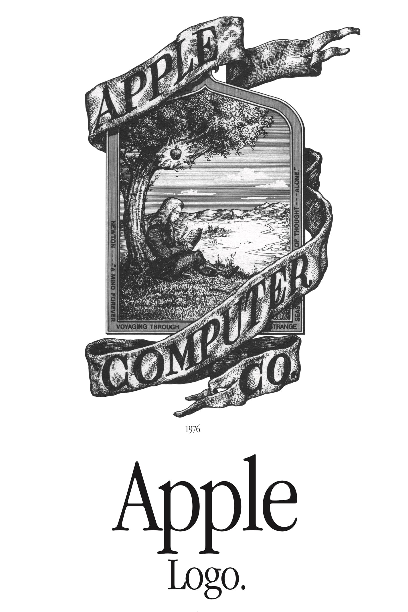 相信很多人也知道Apple是由兩位Steve(Steve Jobs與Steve Wozniak)共同創立。但其實,還有一位不為人知的創辦人Ronald Wayne,當時持有10%的Apple股份!雖然Ronald Wayne沒有正式參與第一台電腦Apple I 的研發工作,但印於產品說明書及廣告上的首個Apple Logo,正正是由Ronald Wayne親手用鋼筆手繪設計的。如畫般的優美構圖,一幅牛頓坐在蘋果樹下的畫像,意境簡單易明,就是啟發與創意。畫像上下均有飄逸的絲帶纏繞,並寫著Apple Computer Co.的字樣(因當時還未上市,所以用Co.而不是現在的Inc.)。外框則引用了英國浪漫詩人William Wordsworth的短詩:Newton──"A Mind Forever Voyaging Through Strange Seas Of Thought—Alone",象徵Apple的製品充滿人性。但遺憾是Ronald Wayne僅僅為Apple工作了兩星期,便因經濟問題以Us$800出售了自己持有的10%股份。及後一年(1977年),Steve Jobs需要一個更直接更簡單的Logo放在Apple I上,所以便把這個設計過於複雜的標誌,換上後來街知巷聞的「六」彩蘋果了。
