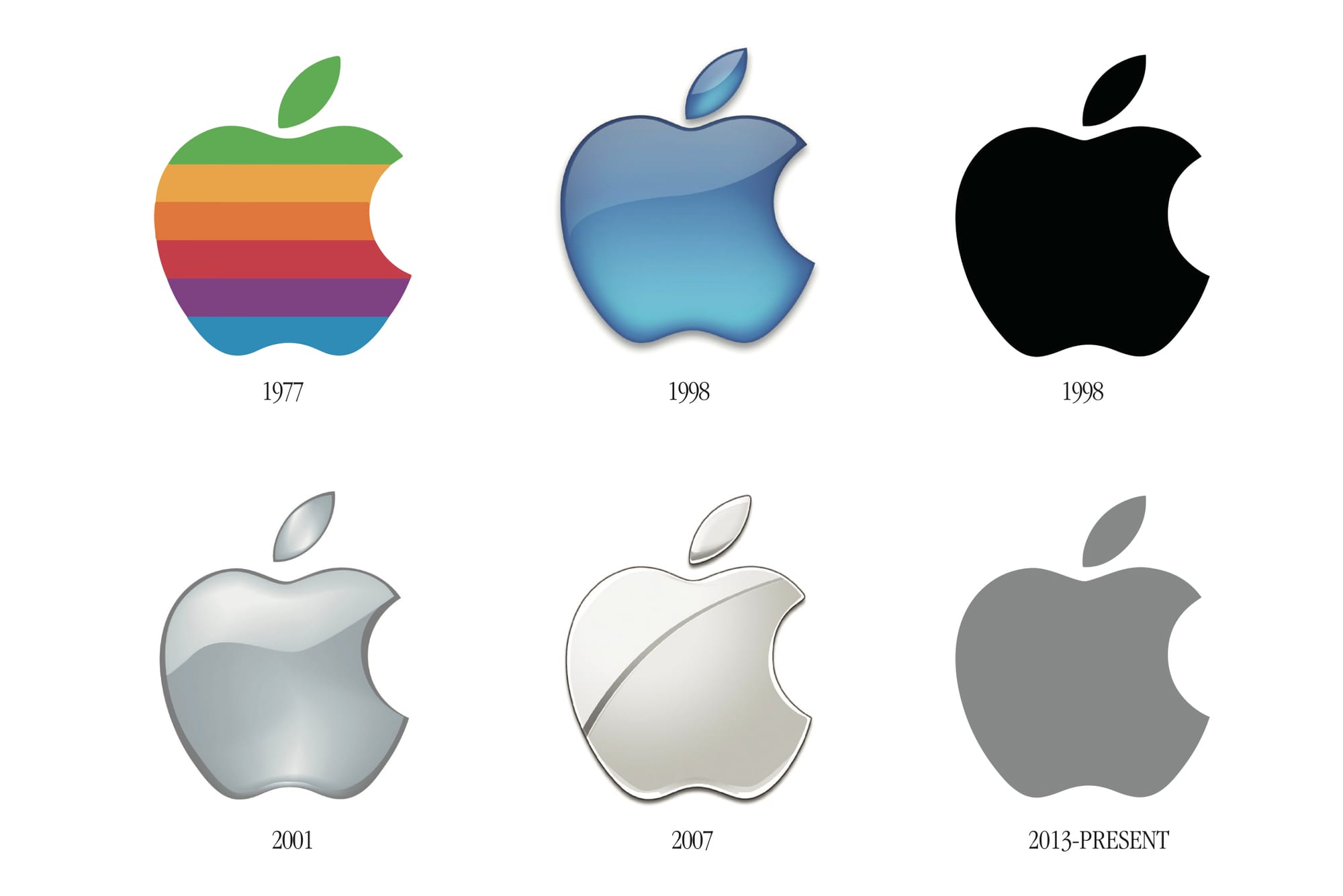 1997年Steve Jobs重返Apple後,決心重整公司,一年後更把Logo改成立體的粉藍色,但不到一年後又改為純黑,其簡潔的概念就在這個時候成形。及後更因 iMac、iBook、Power Mac及G4 Cube等皆採用透明材質外殼,為配合產品,Steve Jobs便用上透明感更強烈的透明立體Logo。