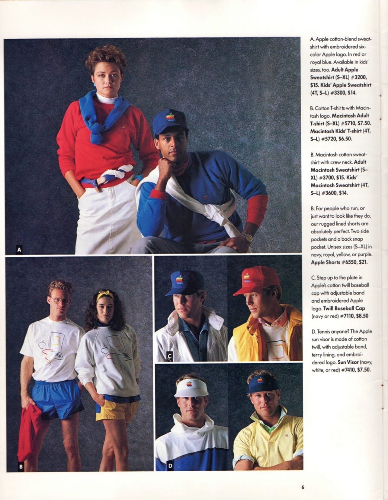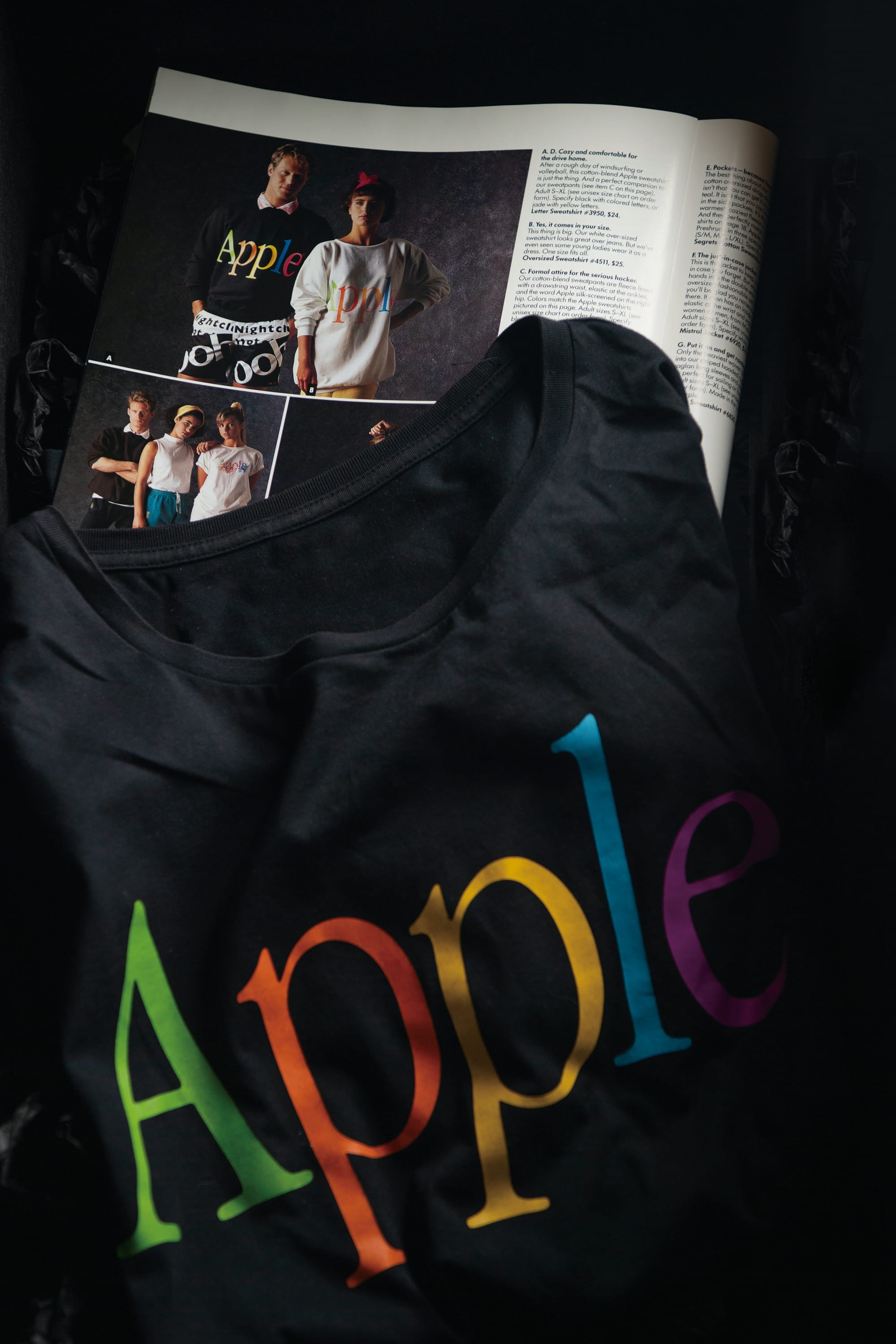 因為《Apple Gift Catalog》郵購活動反應不俗,1986年時大權在握的John Sculley為了想賺到盡,決定大舉進軍時尚產品市場,推出名為「The Apple Collection」一系列時裝服飾。首個登場的「Nineteen Hundred Eighty-Six / Eighty-Seven」季度,其風格也是80年代的大膽用色及闊身剪裁,當然少不了「Apple」大型字樣及標誌的彩虹Logo,搶眼程度可以媲美同期的ESPRIT及Benetton。那些Logo T-Shirt、Matisse Sweater、Baseball Cap⋯⋯都是經得起時間考驗的美製好物,但當年蘋果這個市場策略,並不是人人懂得欣賞。