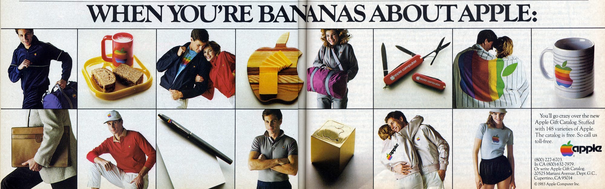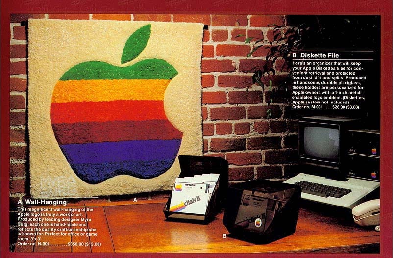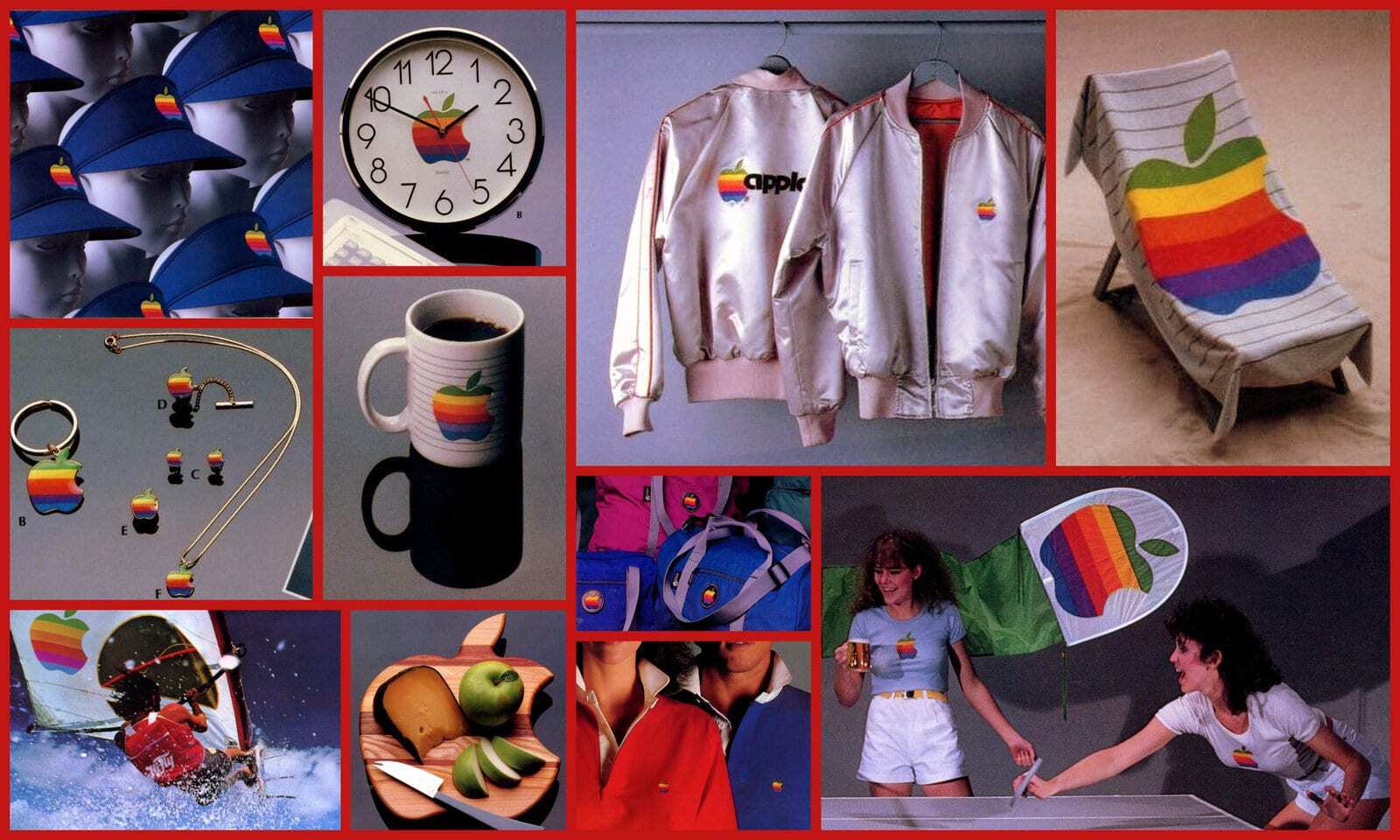 八十年代Apple曾經銳意擴大電腦產品以外市場,1983年Apple以玩票性質製作一系列服飾、文具及生活用品,並輯錄成一本《Apple Gift Catalog》(蘋果禮品目錄),郵寄到果迷客戶家中,產品內容全與彩虹Logo有關。如果有興趣購買的話,果迷可透過目錄內附上的表格、填寫個人信用卡資料及收貨地址,然後寄回給Apple,這樣貨品便會稍後送到府上,原來蘋果一早已發展出一個完善的郵購網絡。