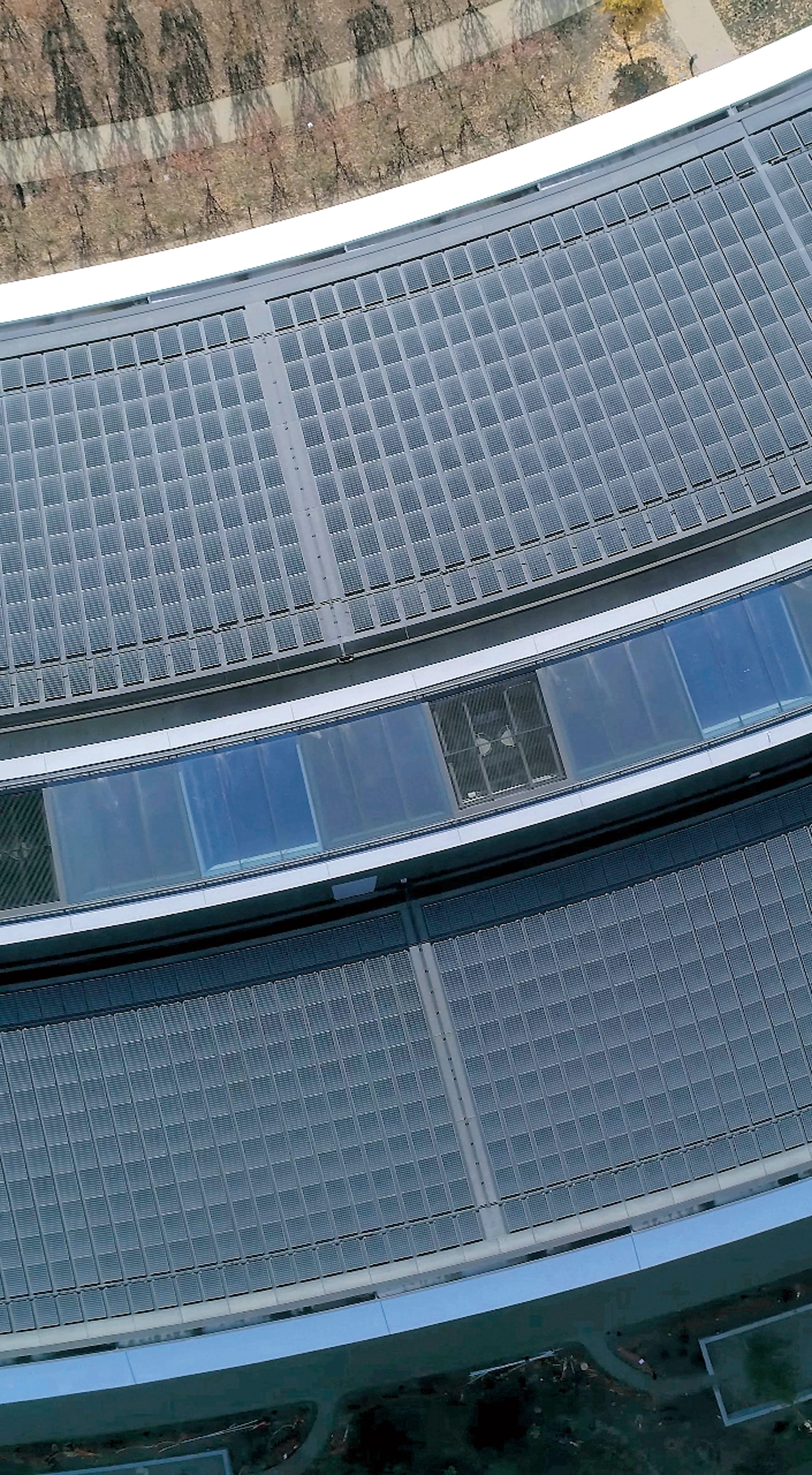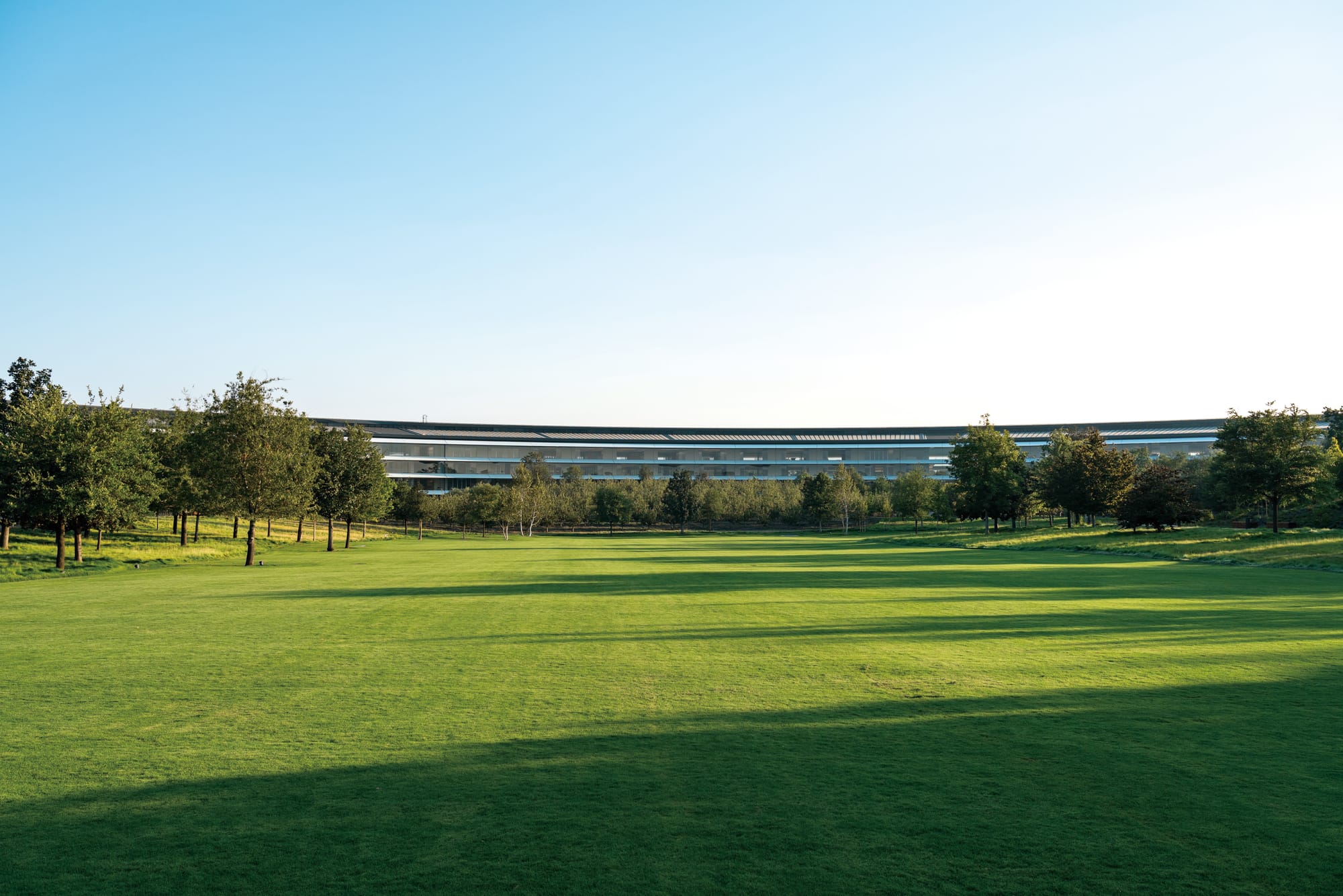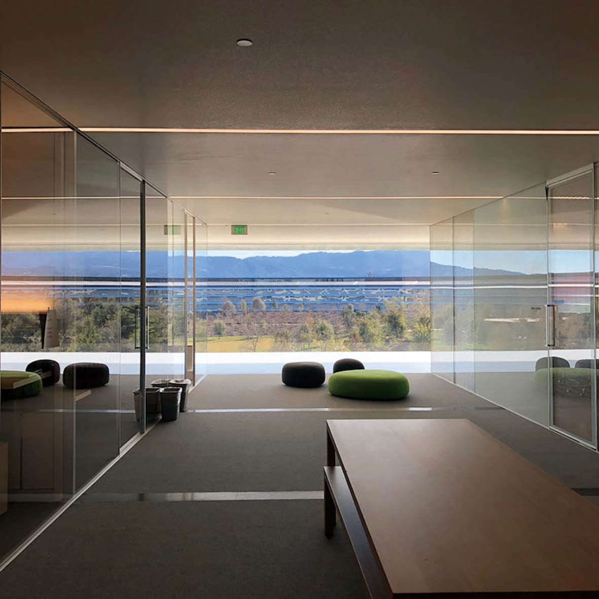 前面提及過,佛學中虛空、淨琉璃世界的理念,影響了Steve Jobs對產品設計的觀點,無垢、透徹的空間除了是Apple Store一直以來的標記,即使在Apple Park,飛船外型的主建築亦同樣保留了其高透明度的特色。然而,為求在環狀建築打造出完美、無縫的圓形,玻璃幕牆因此需要額外加工成曲面,於是Apple就特別聯同德國的玻璃生產商seele以及旗下的sedak一同合作,並製作了一台專用的大型機器,為The Mothership生產出3,000塊淨重3公噸的弧形「Safety Glass」,卻礙於玻璃質量太過清澈,2018年在園區向員工開放以後,就曾經有工人不慎撞上玻璃幕牆而意外受傷。