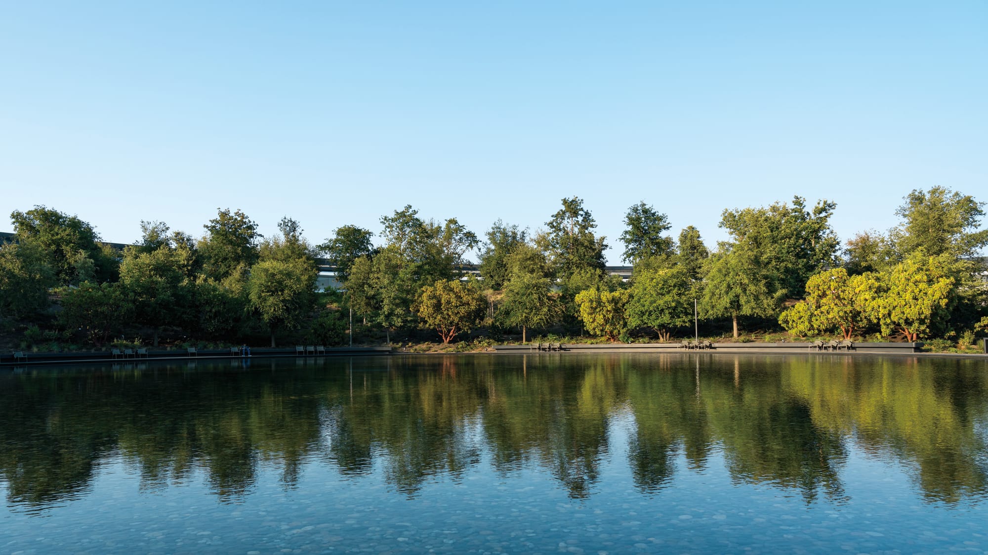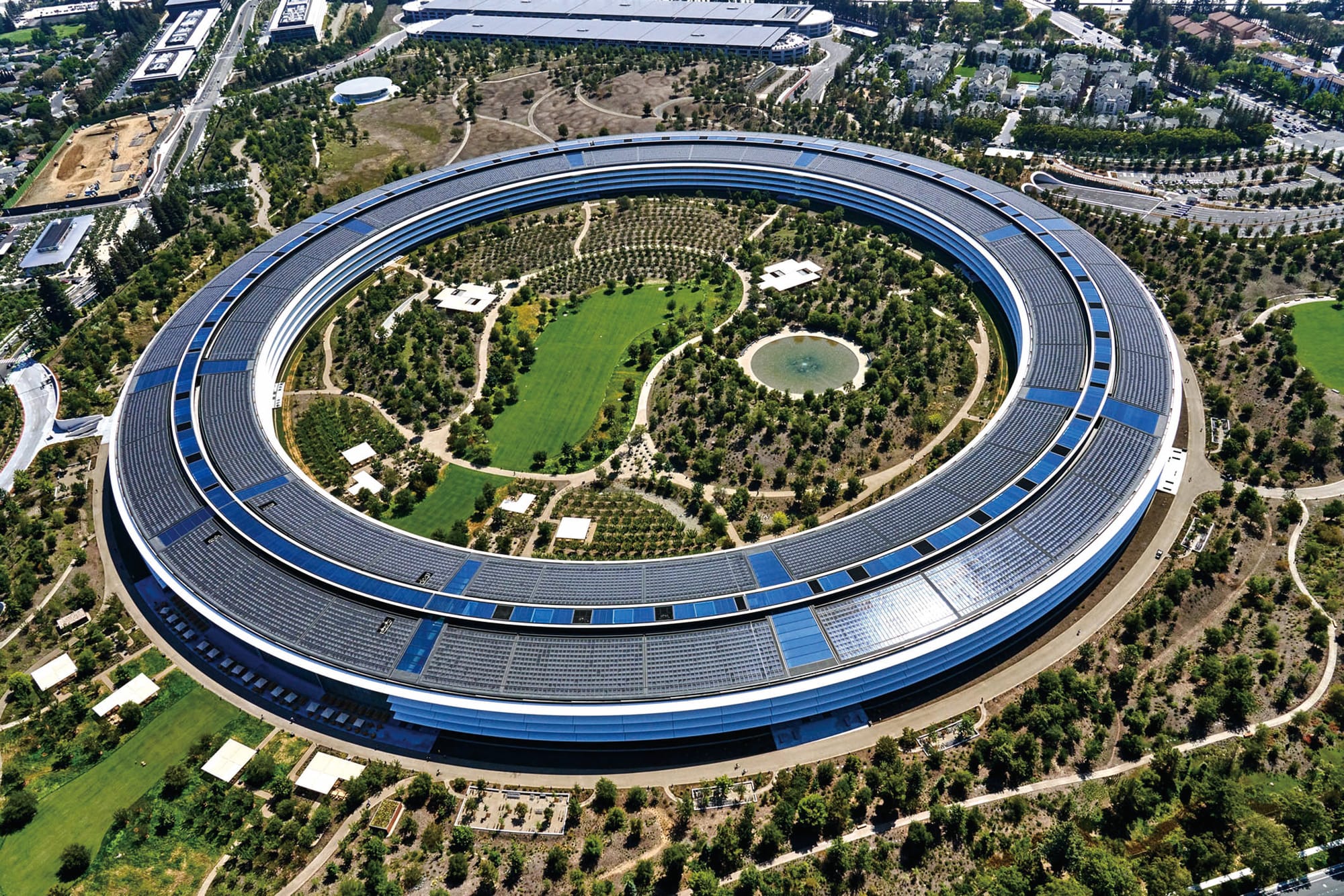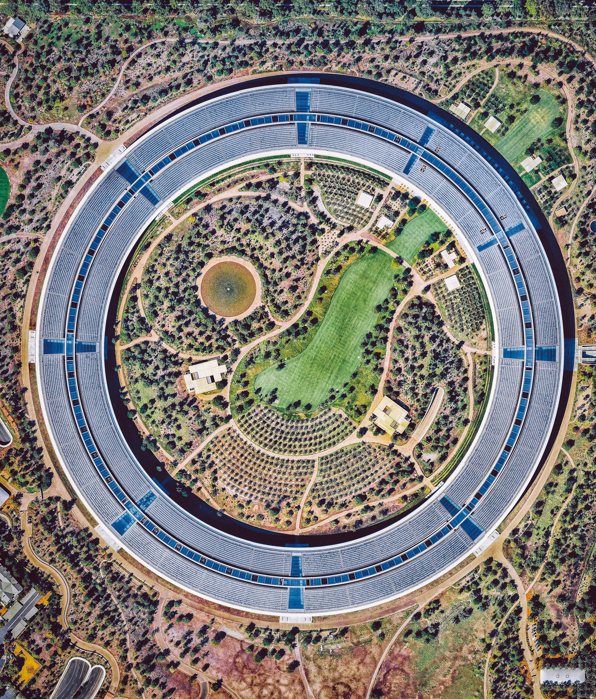「拒絕任何現代化的東西」是Steve Jobs開出的首項要求;其次是他亦希望園區的佈置能夠迎合到加洲當地的自然環境,配合逾3公里長的步行小徑、單車徑貫穿園區內各項建設,讓員工在工作以外能置身於廣闊的郊野,舒緩壓力。至於The Mothership的圓環之內,亦包含另一個佔地12公頃的Inner Courtyard,除連結主建築的Cafe以外,內園區更特別建造了一個人工湖泊,稱為「Ripple Pool」,並透過一個特別的裝置能夠在水面輕輕泛起波紋,猶如日式庭園的「枯山水」佈置,營造出一種脫離俗世的意境。