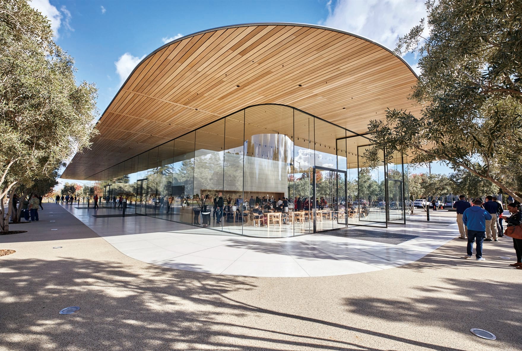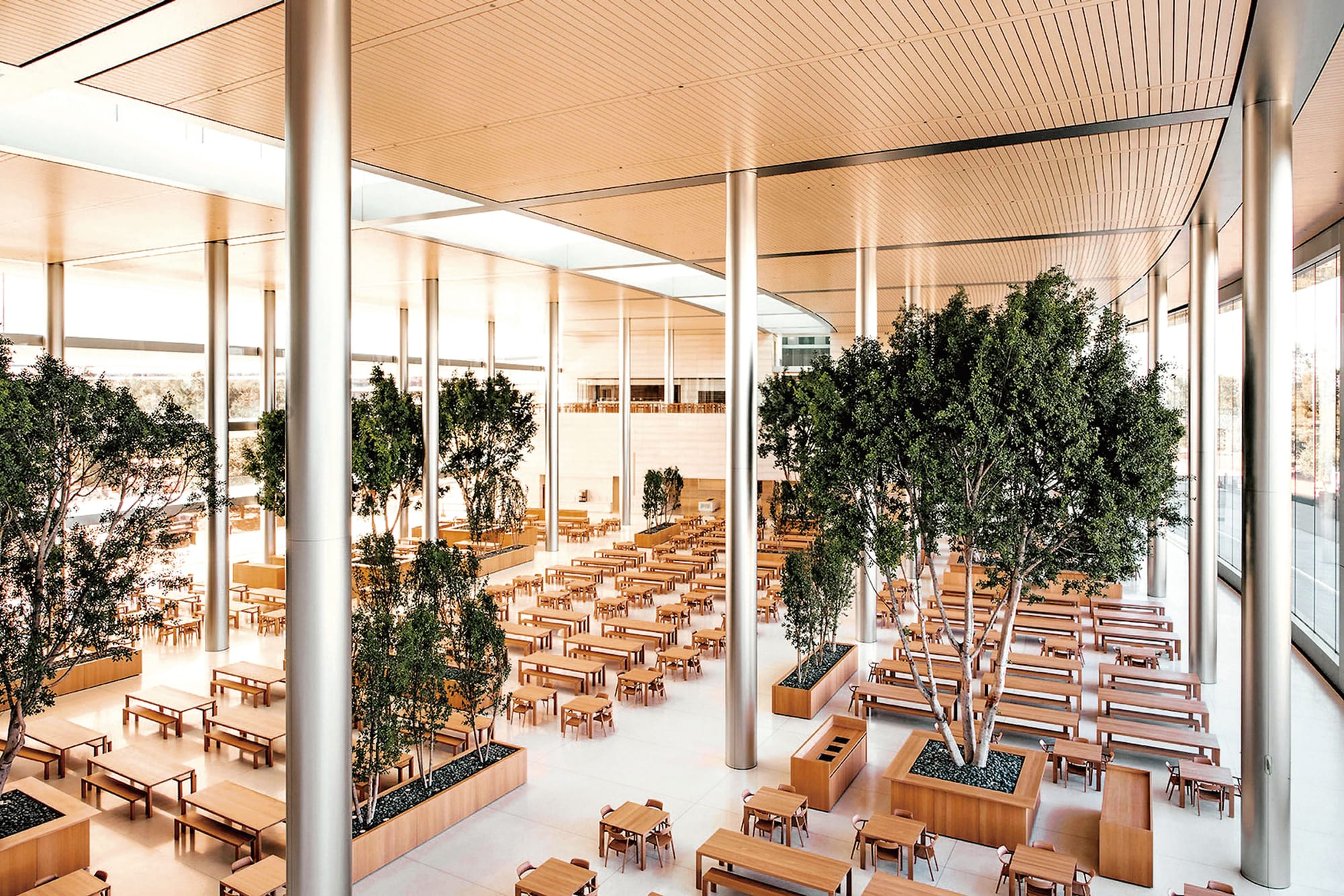 主建築的環狀設計是促進交流的橋樑,而員工專用的餐廳,亦是另一個重要的「會議」地點。Apple Park內共設有7家咖啡店,當中設於主建築內面積最大的咖啡店則樓高3層,非常廣闊的用餐空間接連主建築內、外的綠化園區,位於外環的一面更設置了兩扇跟大樓相同高度 (樓高4層) 的巨型自動玻璃幕門,非常矚目;再襯托上一系列橡木製的桌椅,融合自然基調,建構出和諧恬靜的氛圍。
