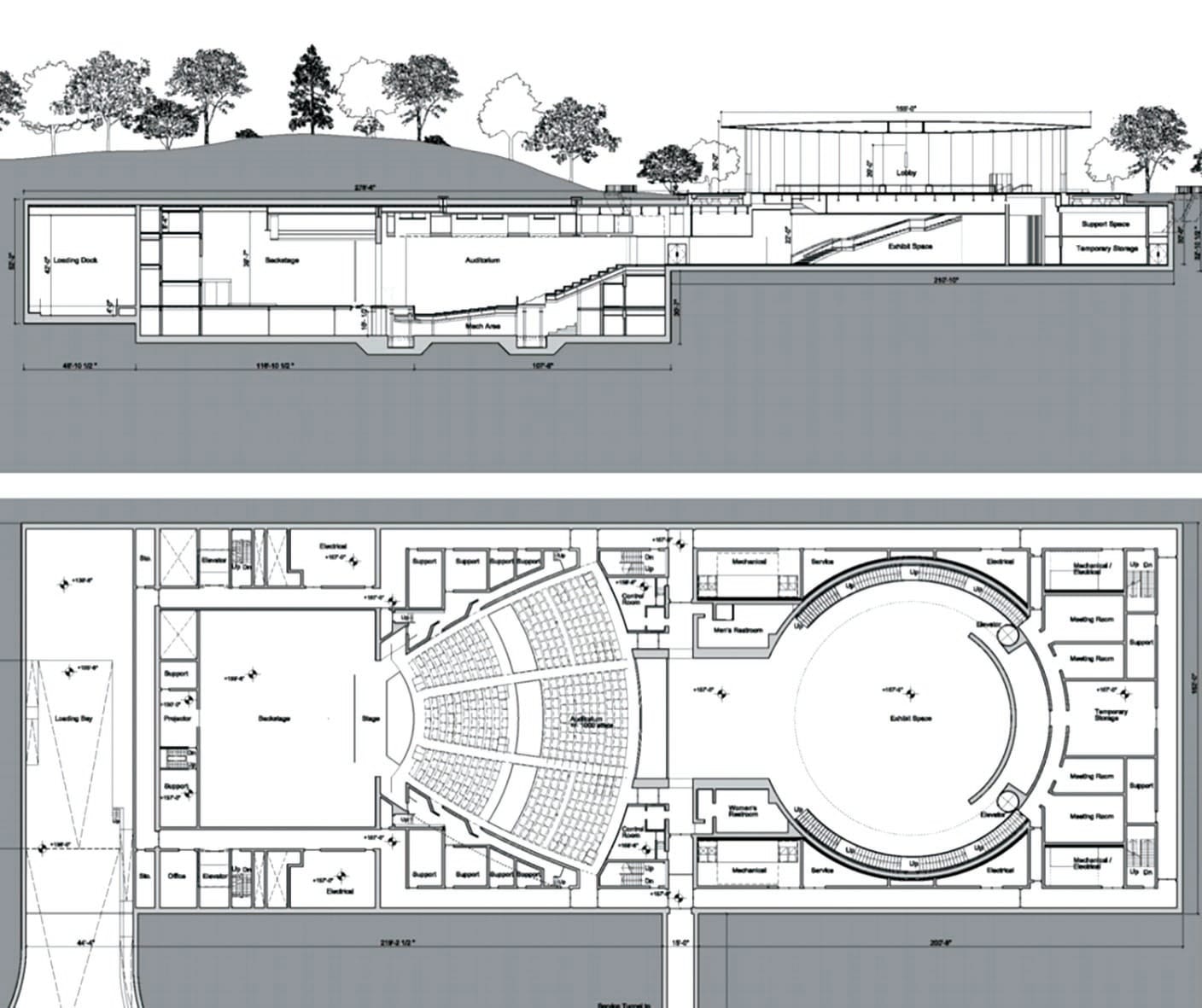 (左)Steve Jobs Theater (右)建設於地底的禮堂結構圖則 (COURTESY OF ABOVEAVALON.COM)