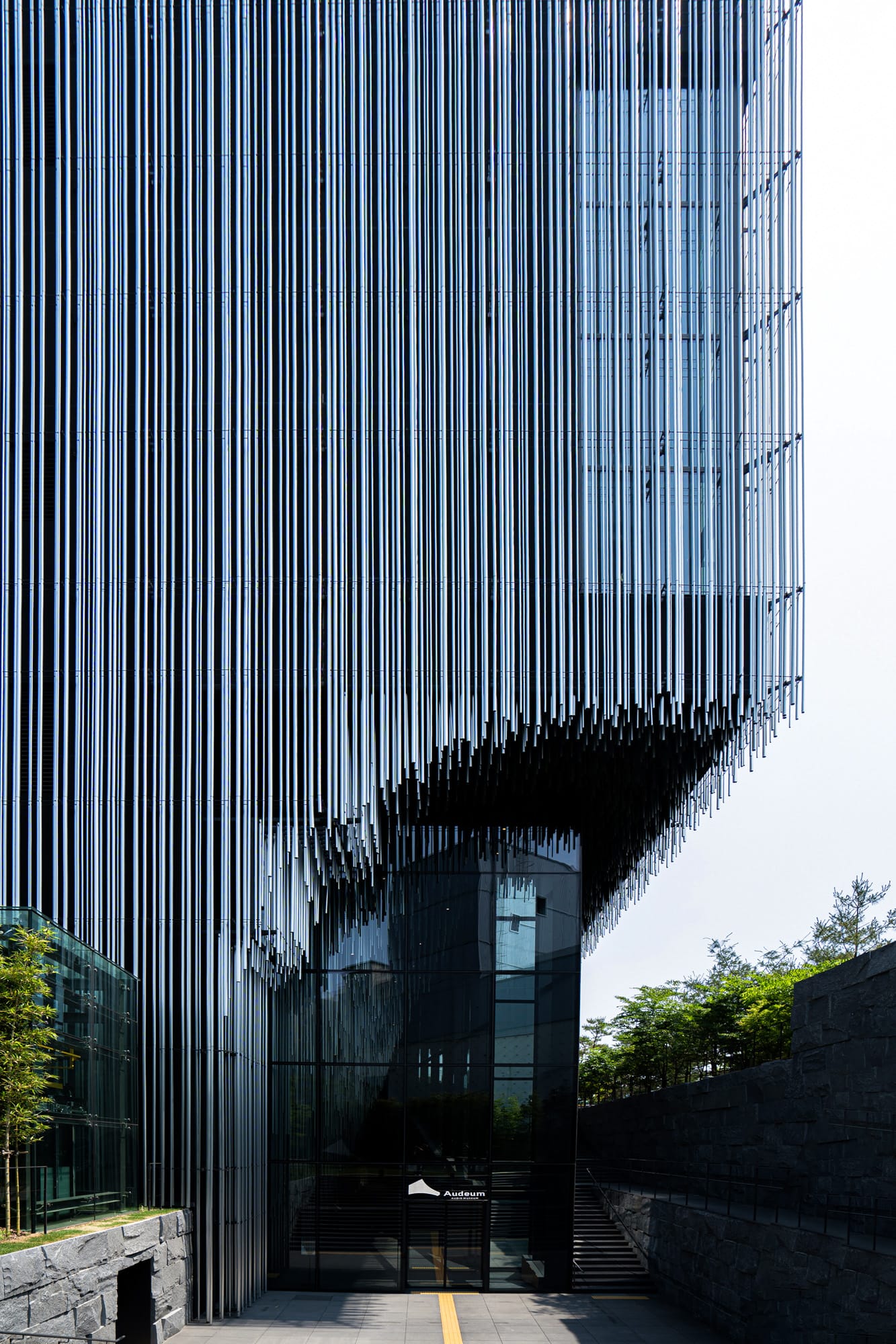 隈研吾嘗試築建一片「森林」,在大樓外牆垂直列陣2萬根鋁管以建構有機線條並為空間帶來隨四時變化的自然光影,樓梯部份則特意選用厚重(超過10cm)的石材建構自然風貌。空間內部選用阿拉斯加的柏木為材,希望藉由視覺上的震撼及清幽木香喚醒我們的感官,最後就可盡情享受聽覺上的體驗。