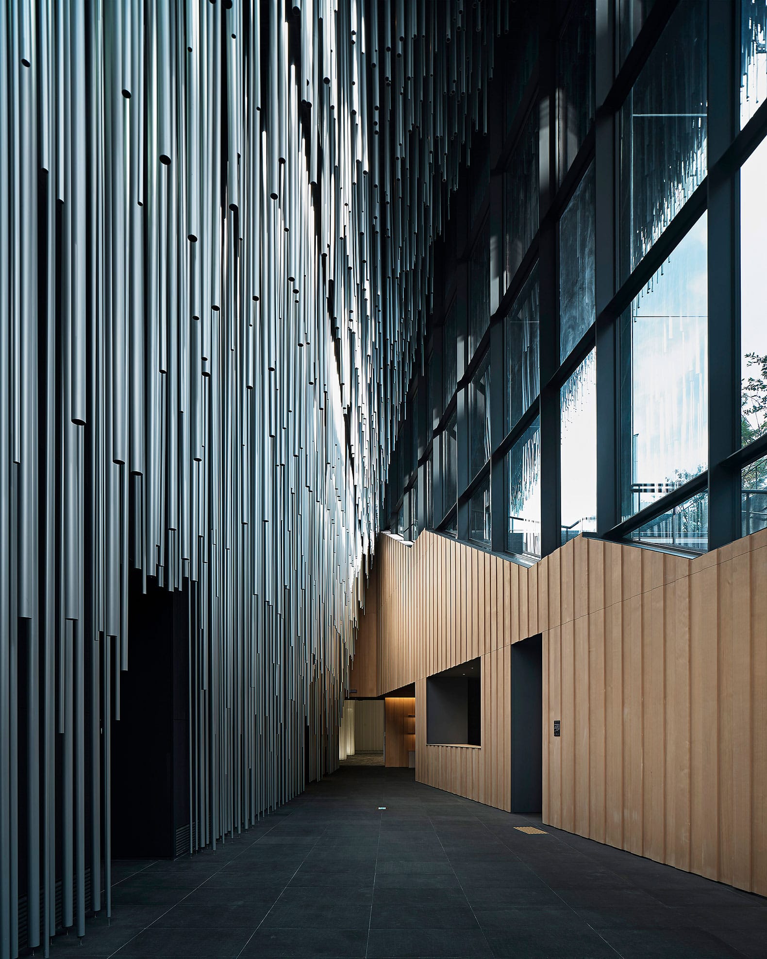 除了鋁管及木材,隈研吾在設計上也運用到特殊的聲學布料,將光線及聲音變得柔和之餘,並盡量展現出聲音的內在潛力。若大家曾到訪北海道的WE Hotel Toya,大概對這如大樹般的設計不會陌生。