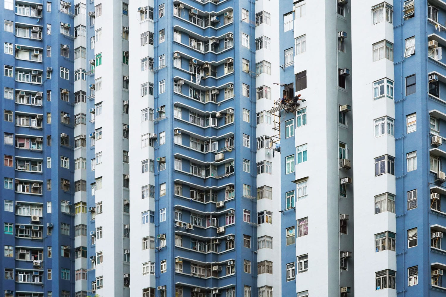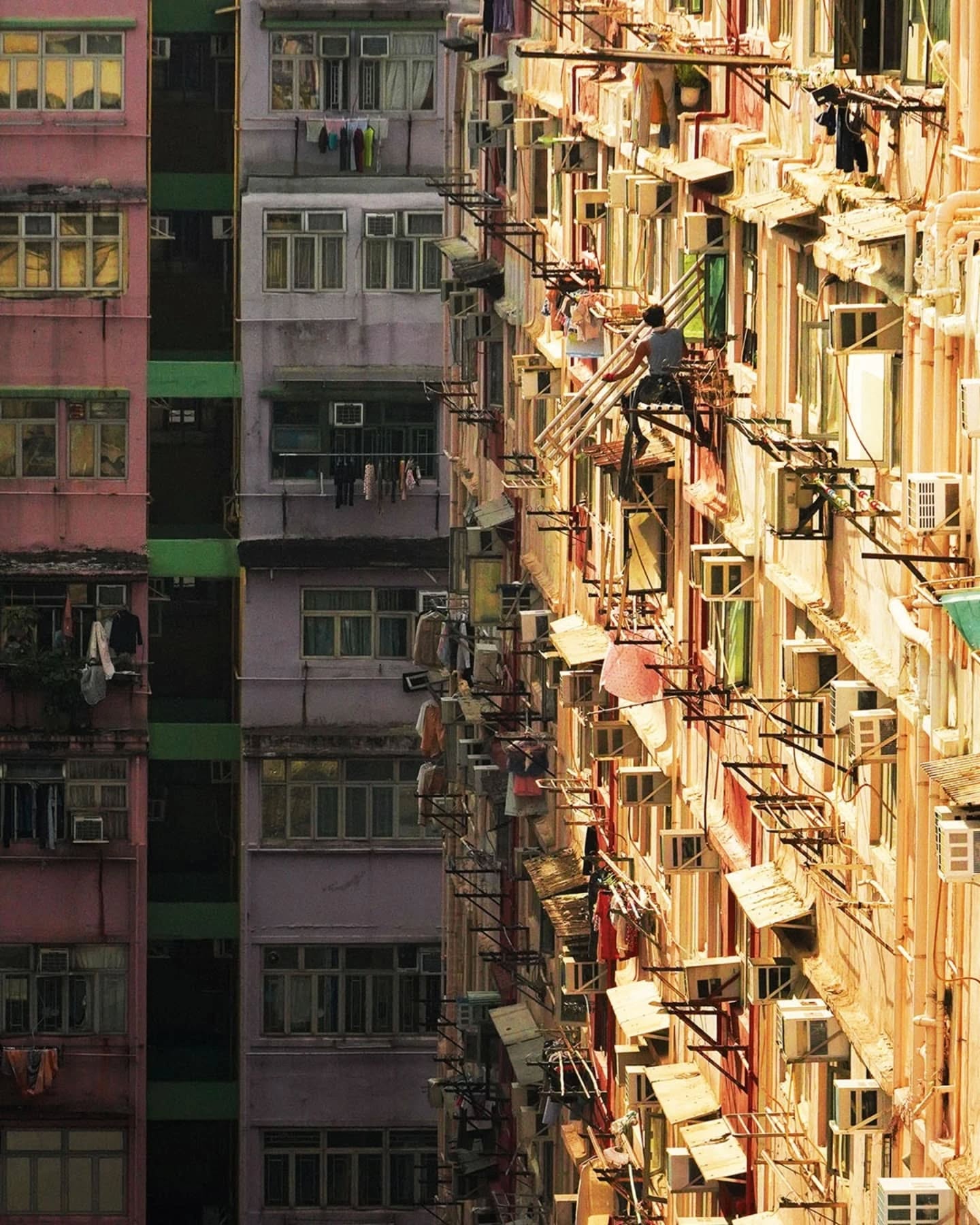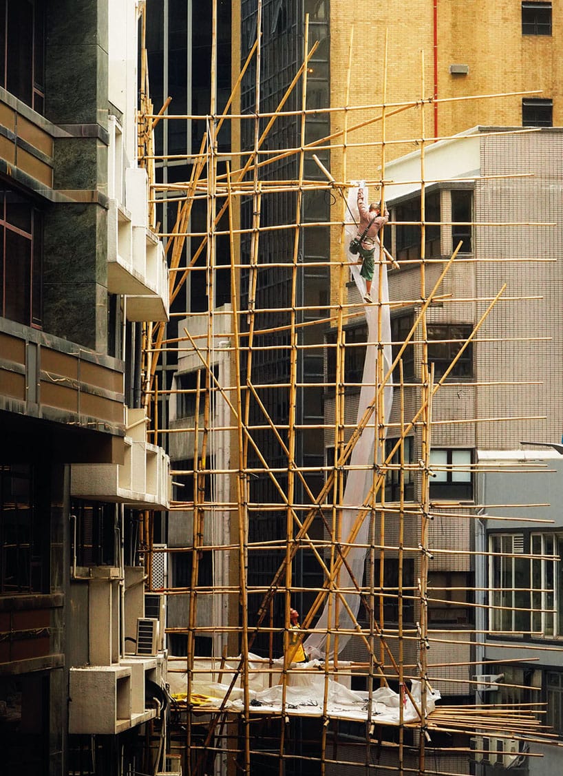 為何會拍搭棚的風景?Romain Jacquet-Lagrèze的第一張照片是這樣拍出來:「我在荃灣舊區尋找那些在大廈上長出的樹木時,發現一個身影高高聳立在半空中。他一腳踩在一個細小的金屬支架上,一手握著一根長竹竿,保持著完美的平衡。」就這樣,Romain Jacquet-Lagrèze隨之將鏡頭轉向這些日常挑戰高空工作的人們,記錄這些「飛棚」的畫面。「竹竿的碰撞聲、電鑽的轉動聲⋯⋯某程度是依賴耳朵來指引我。」究竟搭竹棚這門技藝是否有需要被取代?