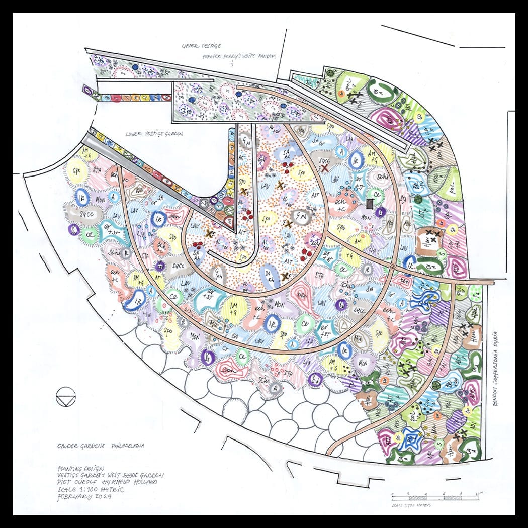 Calder Gardens庭園部份則找來荷蘭園藝設計師Piet Oudolf操刀,他與園林設計師Henk Gerritsen合著的《Dream Plants for the Natural Garden》是業內人士的聖經。他不像傳統設計師只著重於花朵顏色,而是重視植物的結構特徵,考慮葉片和種莢形狀在開花前後的表現,讓花園一年四季都保持美感。要評定一個花園是否真正美好,不在於花期盛開之時,而是花園凋零時仍然能令人動容 。「面對戰爭與種種瘋狂的事情,美是我們在生活中所需要的、是逃離現實的途徑。」他以250款植物及37,000株多年生植物建構出花園景觀,將建築、藝術品和參觀者包裹在一幅不斷變化的自然畫布之中,是一件有生命的雕塑。隨季節變化的花草林木,與Alexander Calder隨風、光及空氣流動而改變的雕塑相呼應。