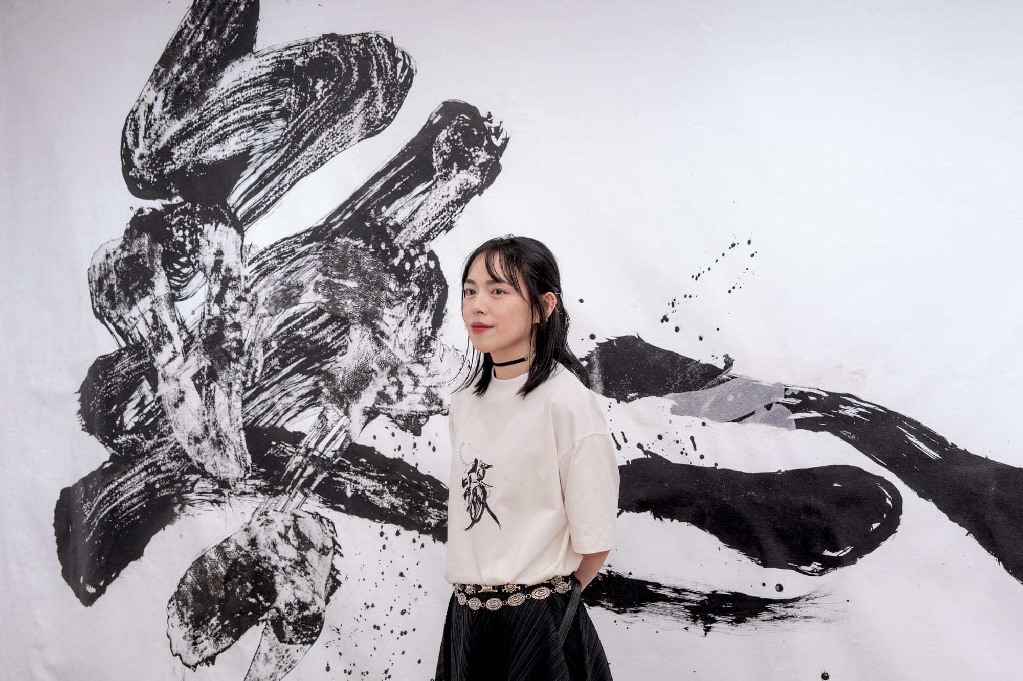 靄凝自2013年入讀香港中文大學藝術系,開始接觸書法;中大畢業後,在網上跟隨日本現代書法家天野碧邨學習,疫情開關後每年更會抽空親自到日本學藝。她所學習的「前衛書」重視創新、具個人特色,是完全脫離文字結構的創作,上田桑鳩、森田子龍、井上有一等人也甚為推崇。只要拋開對書法的固有印象,便可發掘其魅力。