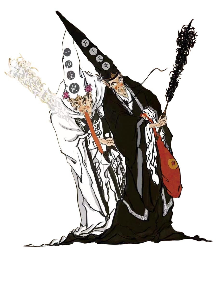 黑白無常,民間又慣稱為七爺、八爺,為地府的勾魂使者,一黑一白象徵一陰一陽,亦是閻羅王或城隍的部下。相傳黑白無常生前是衙門的一對官差,白無常原本叫謝必安,身材高瘦;而黑無常則名為范無救,長得比較矮小。兩人自幼結義,在一次到河邊遊玩期間,謝必安認為天將降雨,於是回家拿傘,而范無救則在河邊守候,期間河水突然暴漲,范不忍失約最終當場淹死,謝得知此事深感內疚,於是亦在河畔自縊身亡。而二人信守承諾的行為最終感動到玉帝,最後獲封成為神明。