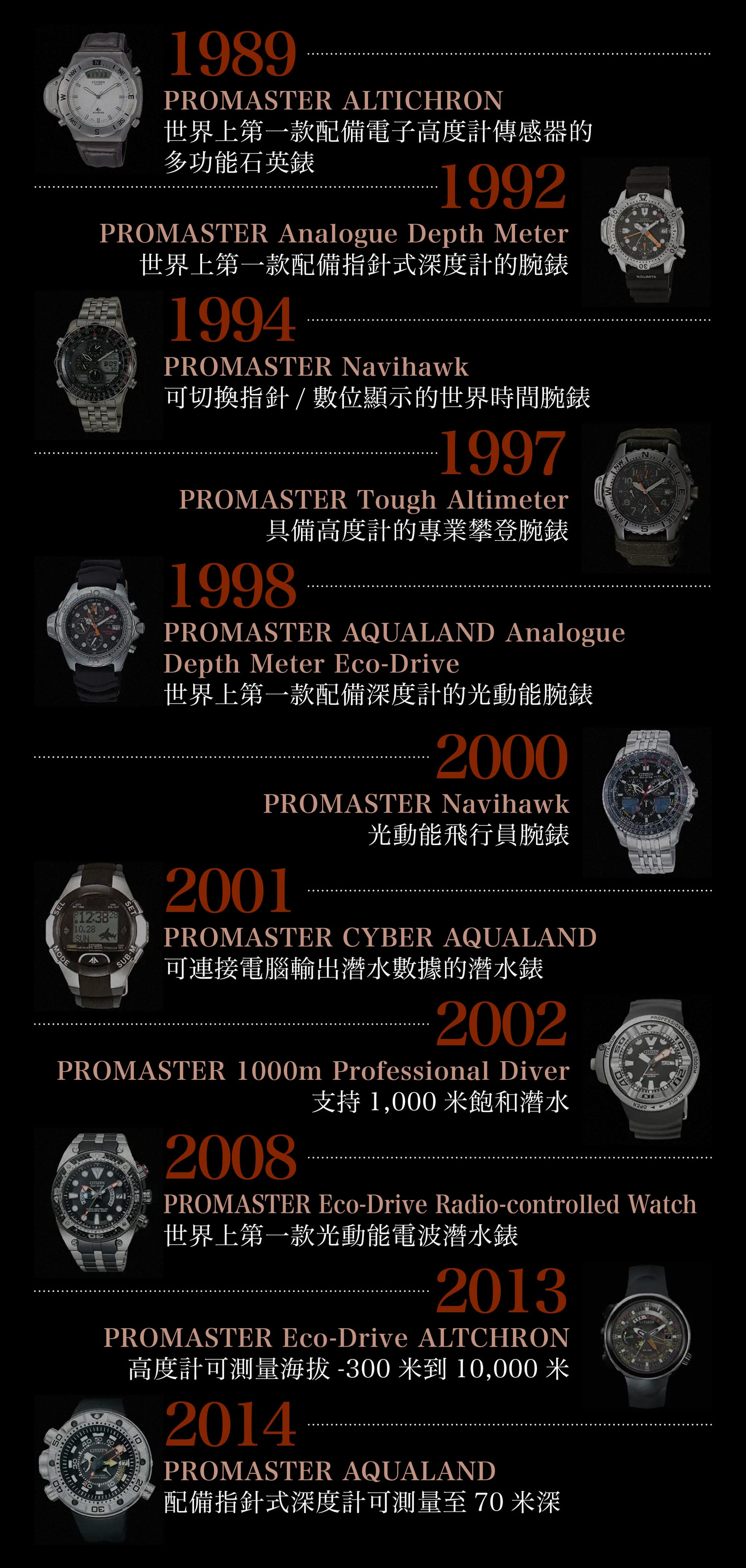 特別為專業運動愛好者和世界各地冒險家而設的CITIZEN PROMASTER專業運動腕錶系列,自1989年誕生以來,憑著出色的性能和耐用性,屬同類腕錶高CP值之作。今年為慶祝此系列踏入35周年紀念,CITIZEN PROMASTER最新推出了3款全新限量款型號,以對應「海」、「陸」、「空」不同環境下的需求。