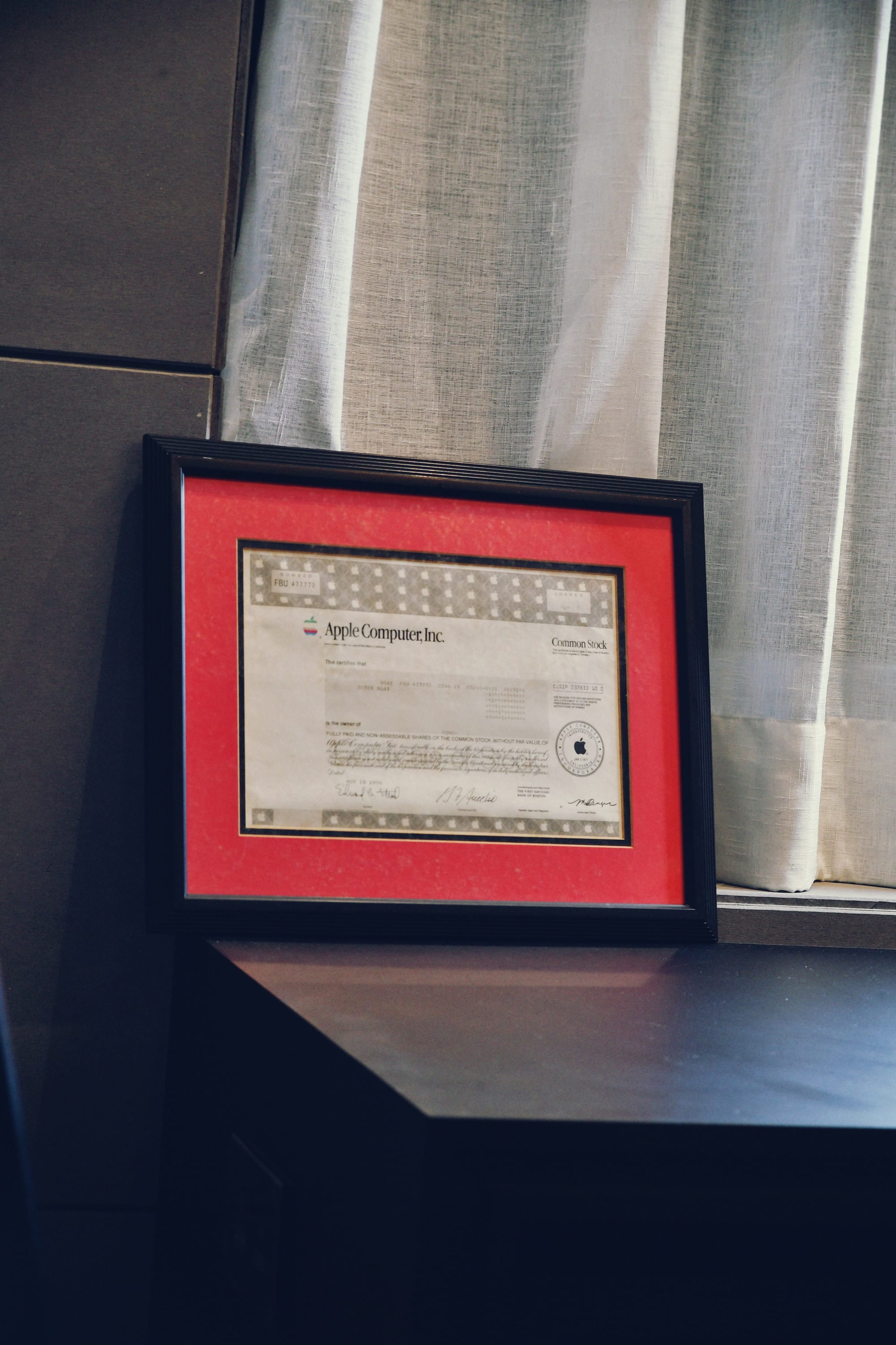 數到Derek的稀世珍品,不得不提他在1996年入手的Apple股票,「我在1996年大學畢業,同時亦是Apple形勢最惡劣的時期,但我覺得Apple的性格、理念均值得讓人珍惜,若在當時公司真的倒閉或被人收購實在太過可惜,故此我在想有甚麼方法可以將它留為紀念;剛好其時發現了一個可供購買美股的外國網站,不僅Apple還有迪士尼、IBM等大公司的股票,買家可以每股方式購買,更會將紙本連框鑲起運到買家手上;而我在當時則買入一股,特別那時Apple的股價僅十多美元,但加上運費等費用卻需花上過千港元,而且還有機會變『廢紙』,現在回想起還真覺得相當奢侈。」