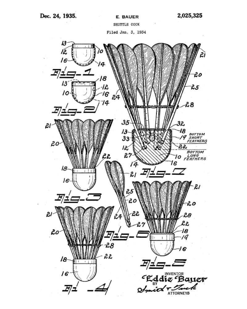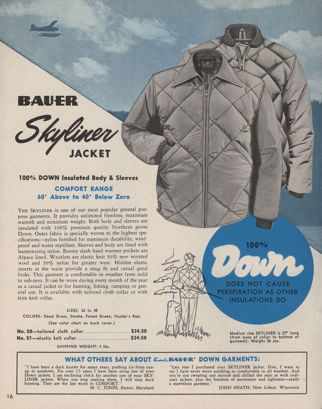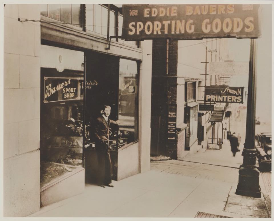 1920年,Eddie Bauer在西雅圖開設了專賣運動用品、釣具的商店。隨後於1934年,他又以帶羽莖的鵝毛改良了傳統羽毛球設計,更於翌年取得設計專利。翌年,Eddie Bauer與友人相約於華盛頓州釣魚,卻因為突如其來的暴風雪讓他險些因低溫症而喪命,意外卻啟發了他研究以絨毛材質充填外套,以取代舊式羊毛設計。5年之後、即1940年,Eddie Bauer的Skyliner Jacket正式取得專利,成為首個公認的羽絨外套設計。