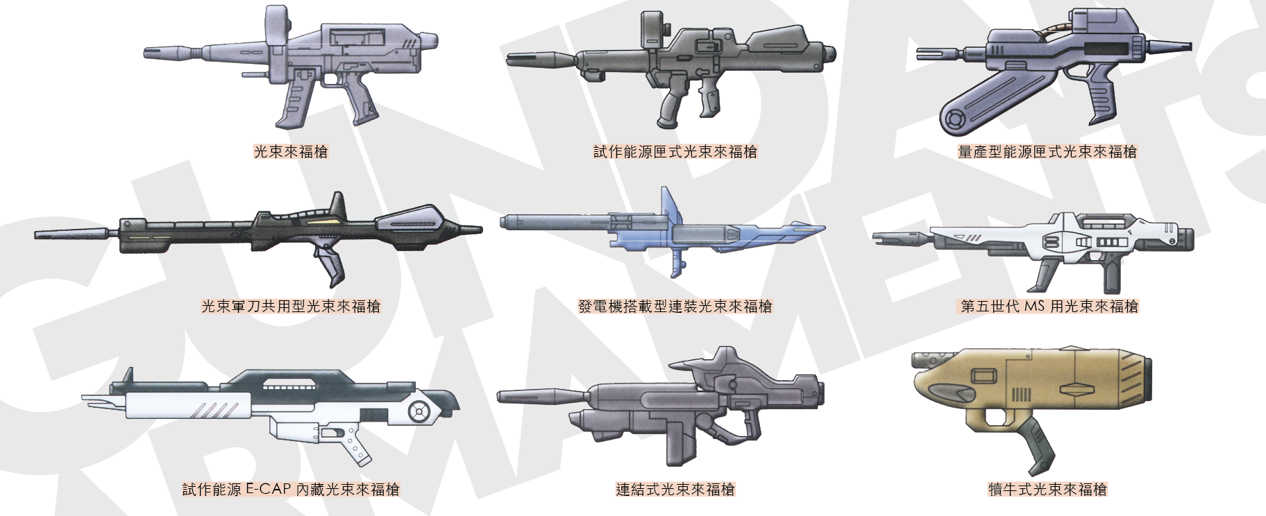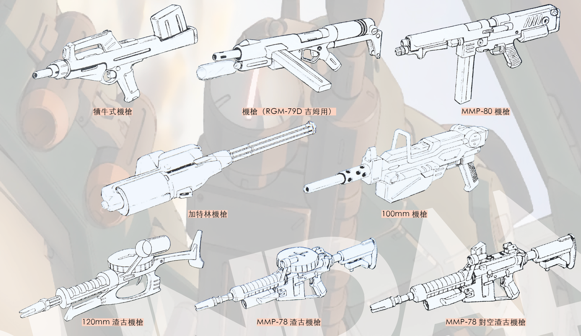 對於MS或是MA的機體而言,機槍無疑定屬常規設備之一,其亦成高達世界中最為普遍的武器。然而因應不同機體規格及需要,機槍款式五花八門可謂數之不盡,有如渣古機槍、犢牛式機槍、加特林機槍等等。