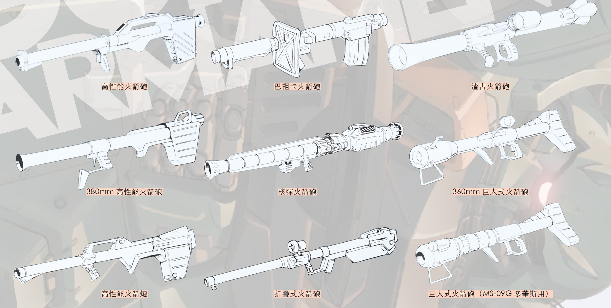 光束來福槍的面世無疑為MS的武裝帶來革命性的影響,當然高度機動性定屬光束來福槍的優勝之處,但隨著科技進步其應用亦逐漸變得普及,在各軍武力慢慢形成對等之時,以光束技術所衍生出的新式武器種類亦盡見繁多,其中一項則屬光束火箭砲。的確比起光束來福槍,光束火箭砲的便攜性與機動性均不及前者,但攻擊效果與範圍卻更見優秀,不難理解打從U.C.0120年代起,光束火箭砲亦成為MS機體的主流武器。在光束火箭砲尚未登場之時,曾出現過一款名為「光束發射器」的武器,不論其外型或是使用方式均參照傳統實彈火箭砲而設,有如扛在機體肩上發射等等,當中曾使用過光束發射器的MS機體就如高達F91。