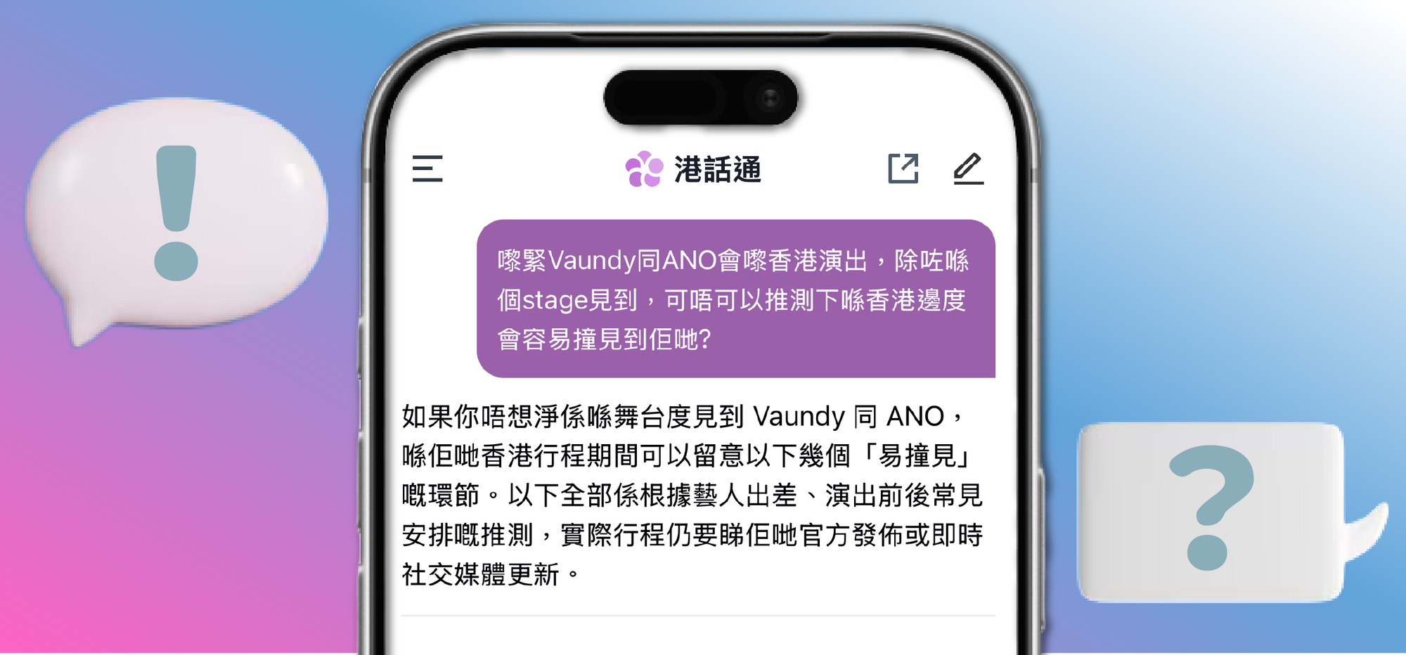 早前佐藤健訪港,不少粉絲在街上偶遇偶像;Vaundy與Ano將於今個星期來港演出,現在既然有「港話通」幫手,相信能提升大家捕獲偶像的機率。實測查問,它經過分析推測後提供了幾間After Party酒吧及中環食店和酒店的名字,可是命運這回事還是說不準。