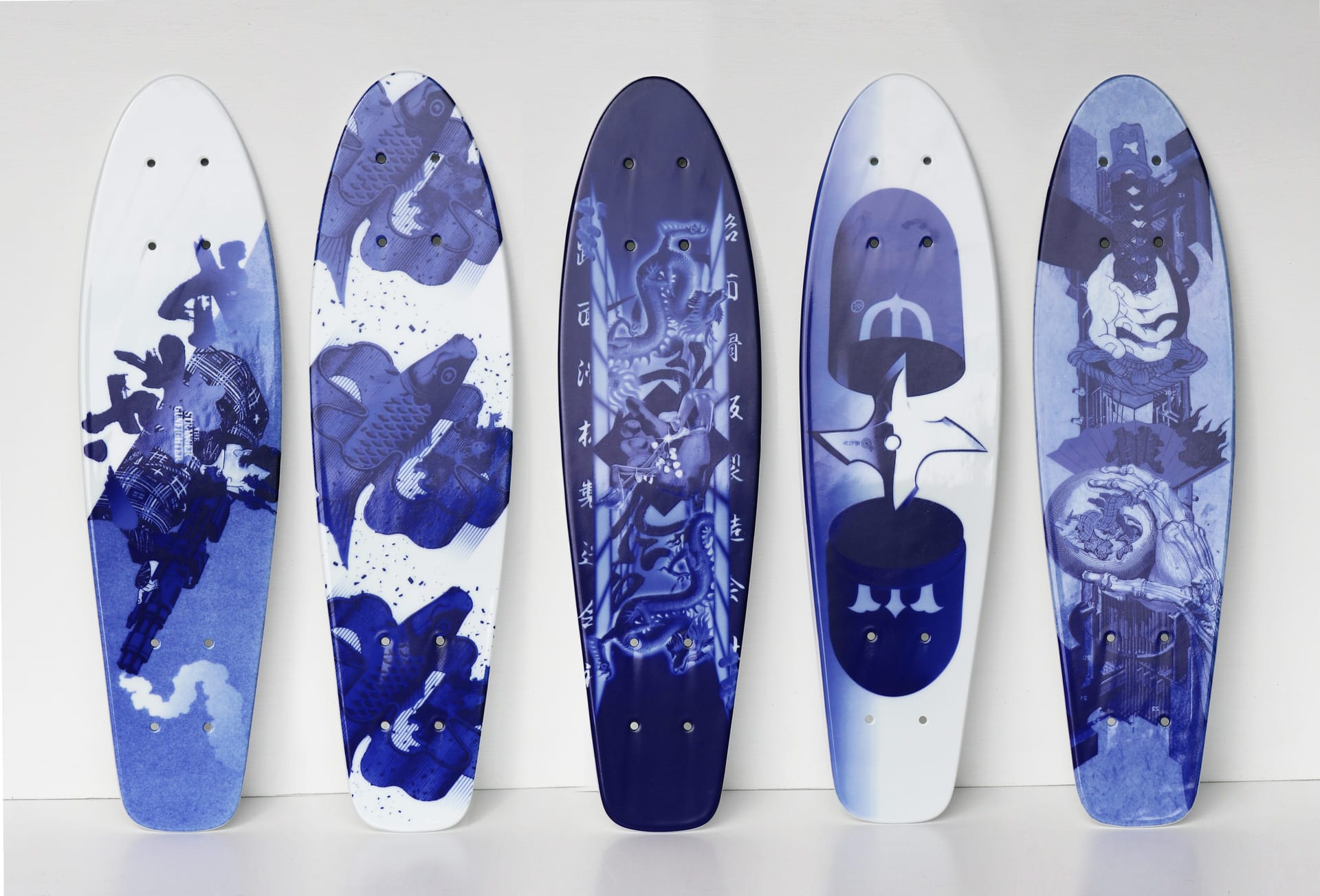 Maruhiro與Evisen Skateboards聯乘合作,全塊用釉上彩手繪,圖案複雜程度極高加上極多色彩的花紋圖案。成品效果不老土,實在難能可貴。