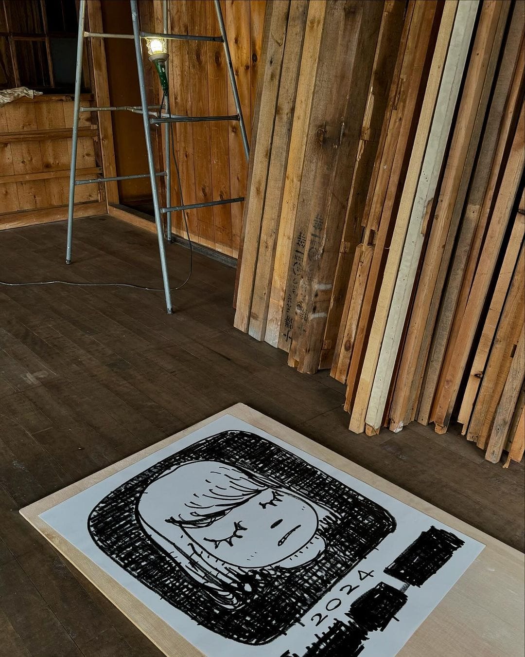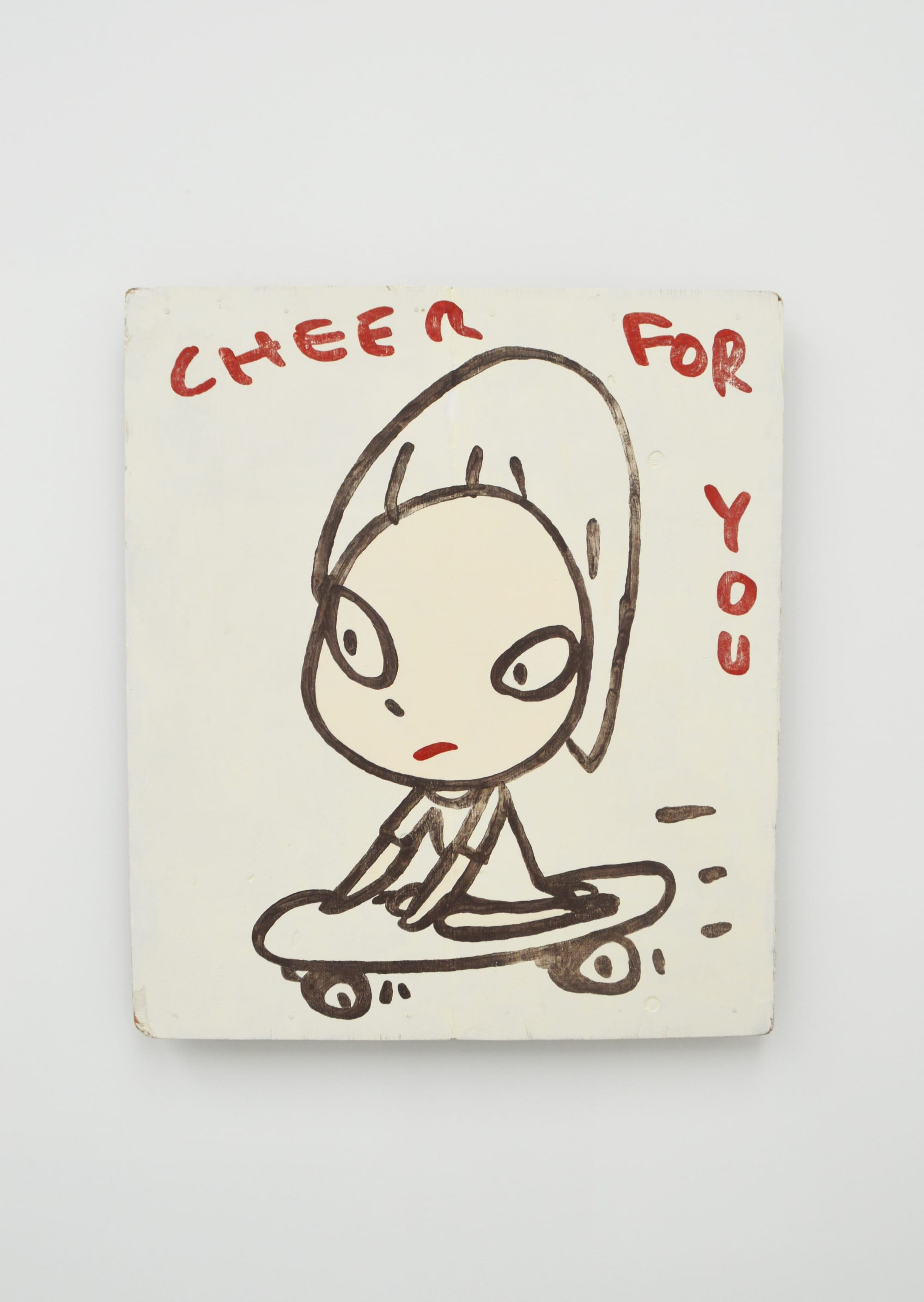 奈良美智有感這偏遠的鄉村環境與其童年時代成長的青森頗為相似,讓他安心地在木屋內作畫,日前這批新作於他在東京的最新個展中正式登場。標誌的可愛女孩並配上「CHEER FOR YOU」、「WE ARE OUTLAWS YES!」等字句,就如發表宣言一樣。
