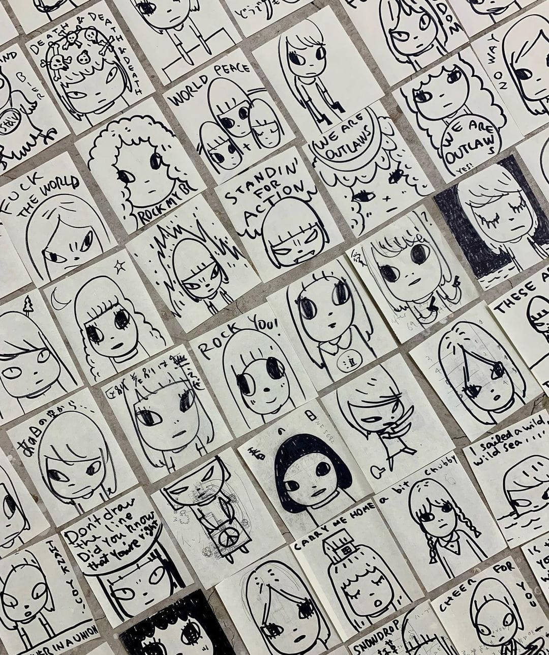 標誌的可愛女孩並配上「CHEER FOR YOU」、「WE ARE OUTLAWS YES!」等字句,就如發表宣言一樣。這批新作構圖的概念有不少是源於奈良美智今年初在筆記本紙上用黑色Marker畫下的草圖,他用柔和的色調將最初的想法放大,道出自己的立場。