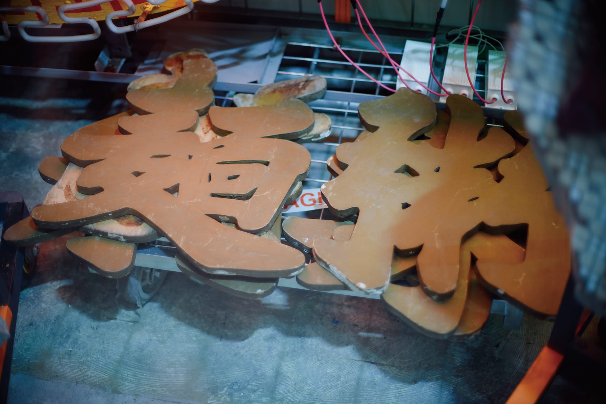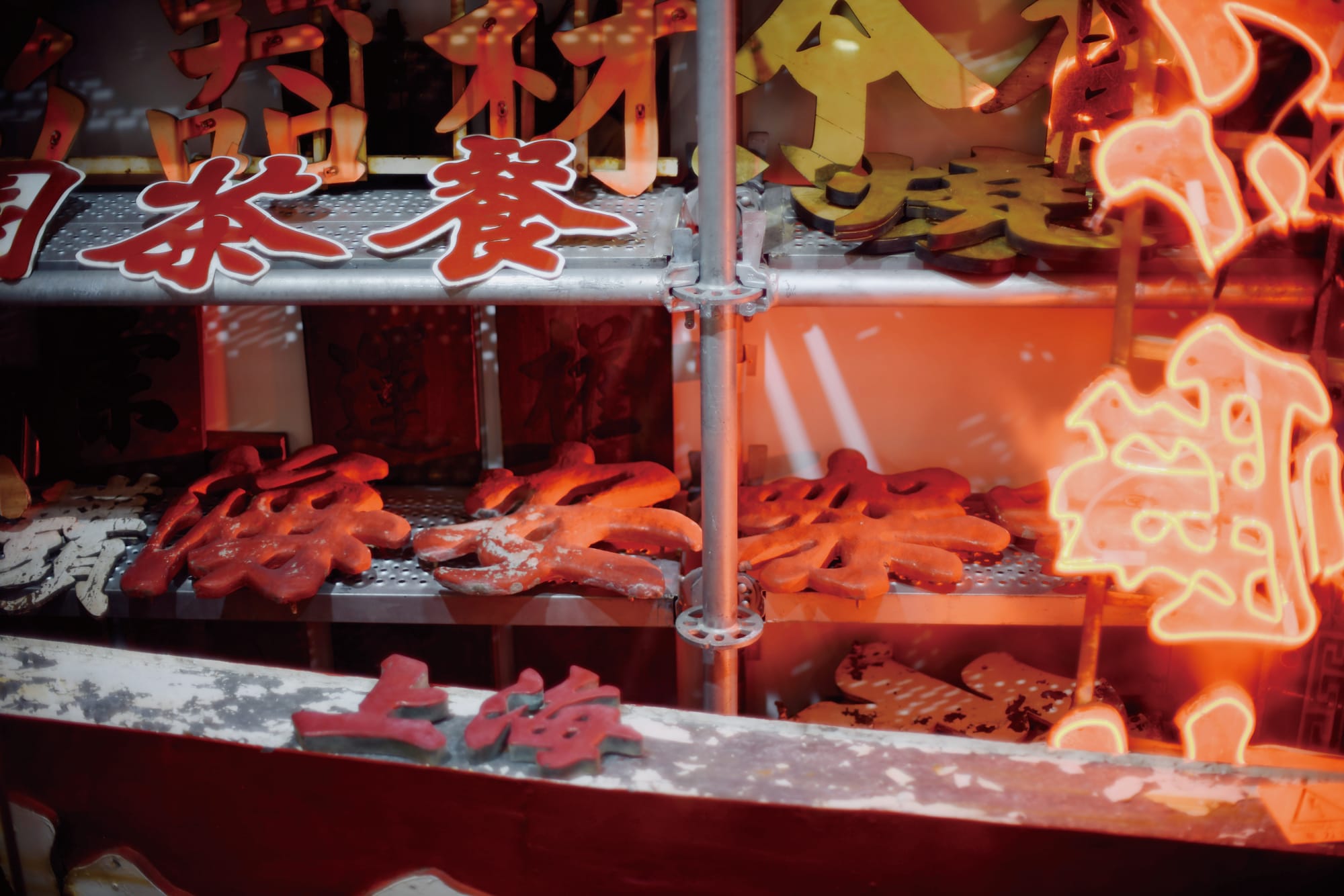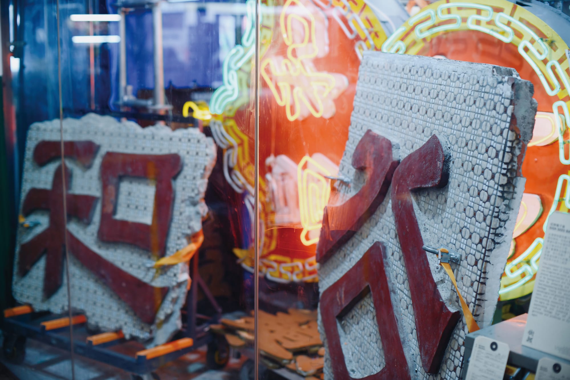 比較特別的是九龍城公和荳品廠室內牆上的水泥字,這種招牌字本身為建築物的一部份,要拆下保留難度較高。而店主特別安排承辦水泥字連同背後的牆身完整拆下(仍可看到牆身上的舊式紙皮石飾面)再交由我們保留,由於每塊字的重量達二百至三百公斤,運送及展出的方式都需要詳細計劃,剛好這次尖沙咀建築雙年展的地舖適合展出這組招牌。」單是物料的運用已是一門美學,一個招牌一個世界。