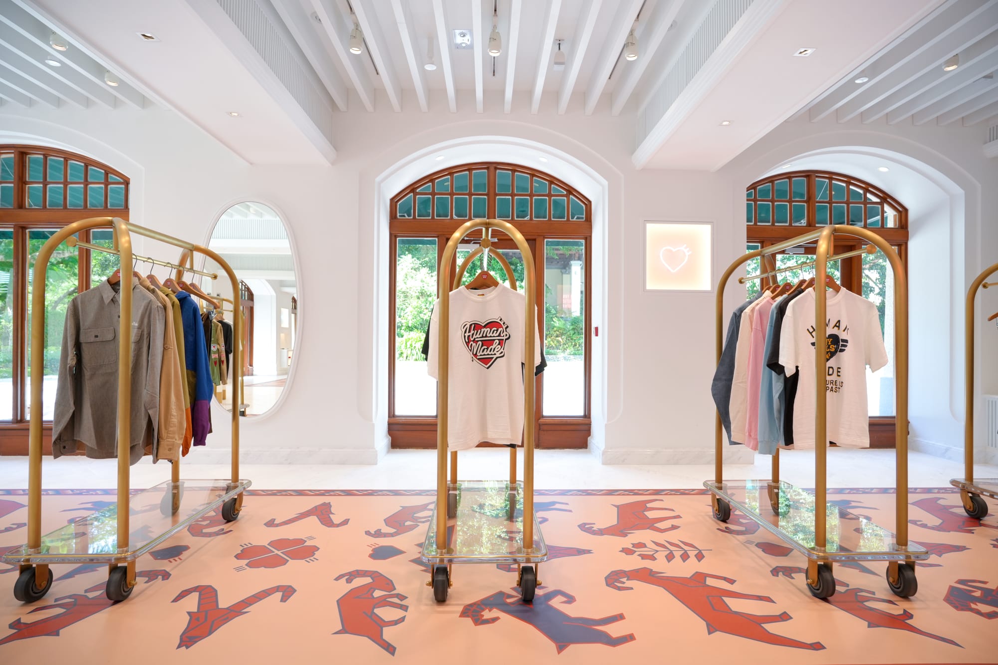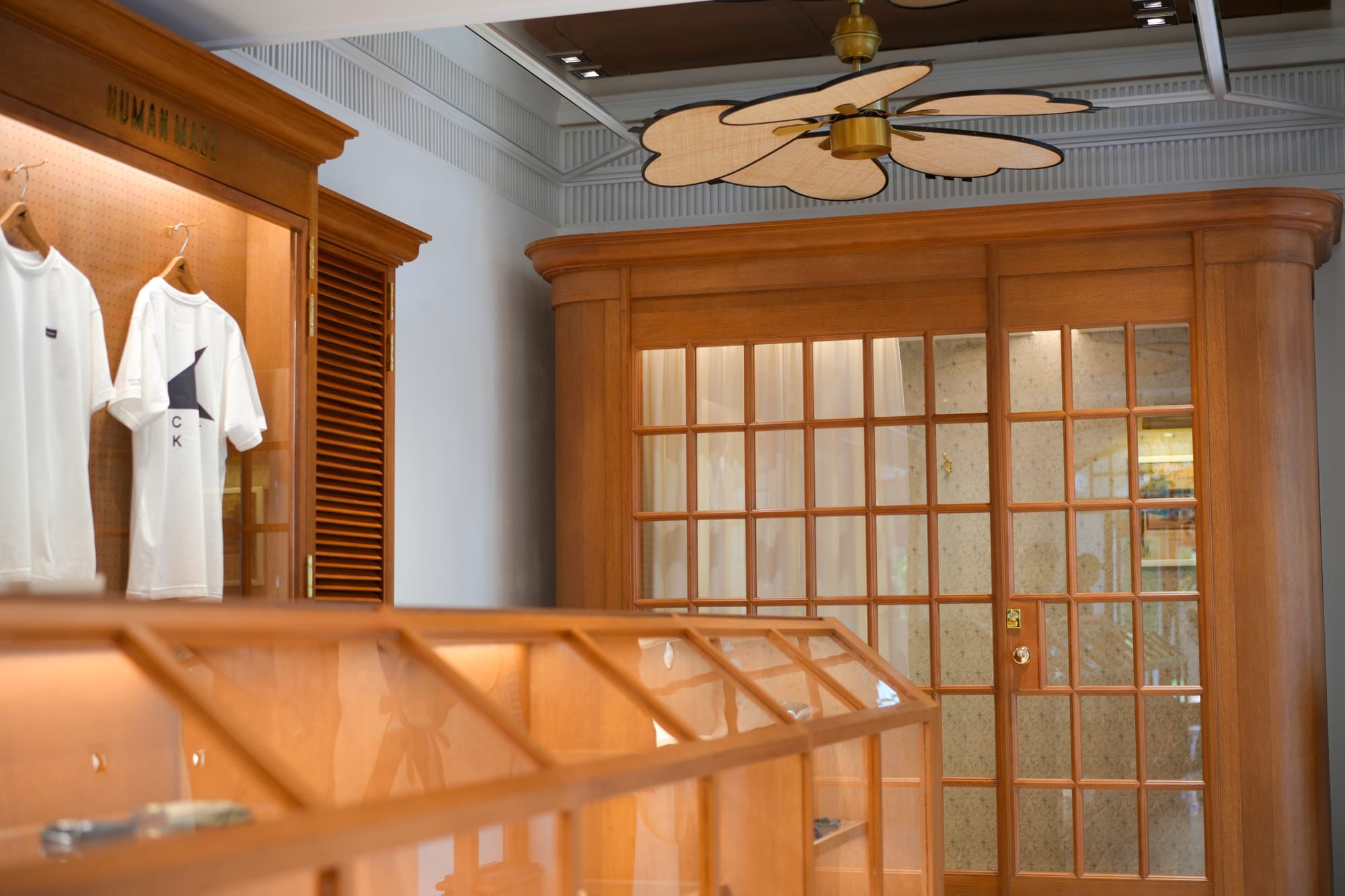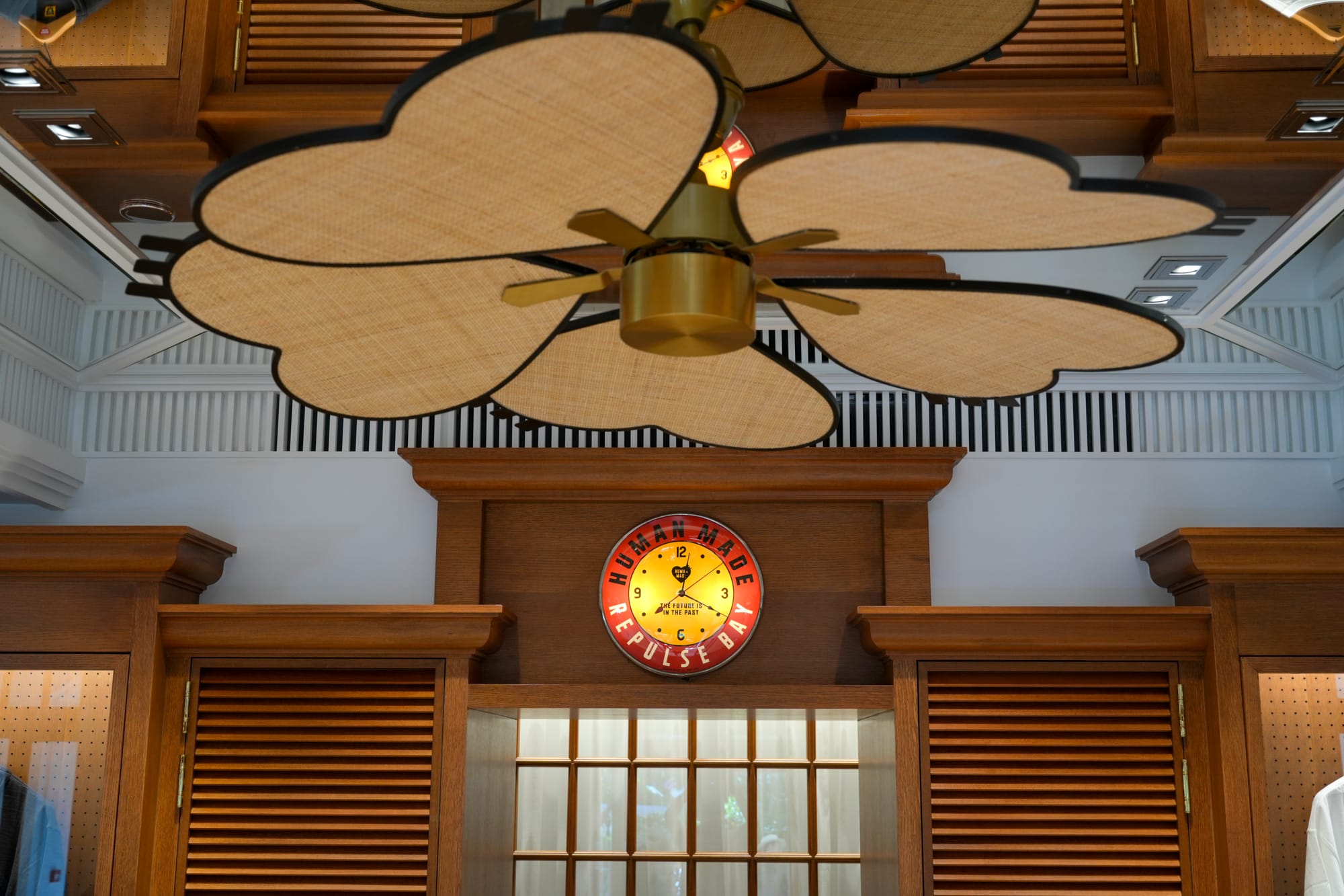 Wonderwall團隊因應淺水灣地利環境與及歷史感,而構想出獨特之內裝概念。對每一個細節都力求完美,以精準的設定技巧去呈現華麗舒適的購物空間。度假酒店風味的吊扇、木門上的邊框、復古霓虹燈⋯⋯都加入了HUMAN MADE最為人熟悉的心形Icon,動人細節令門店生色不少。
