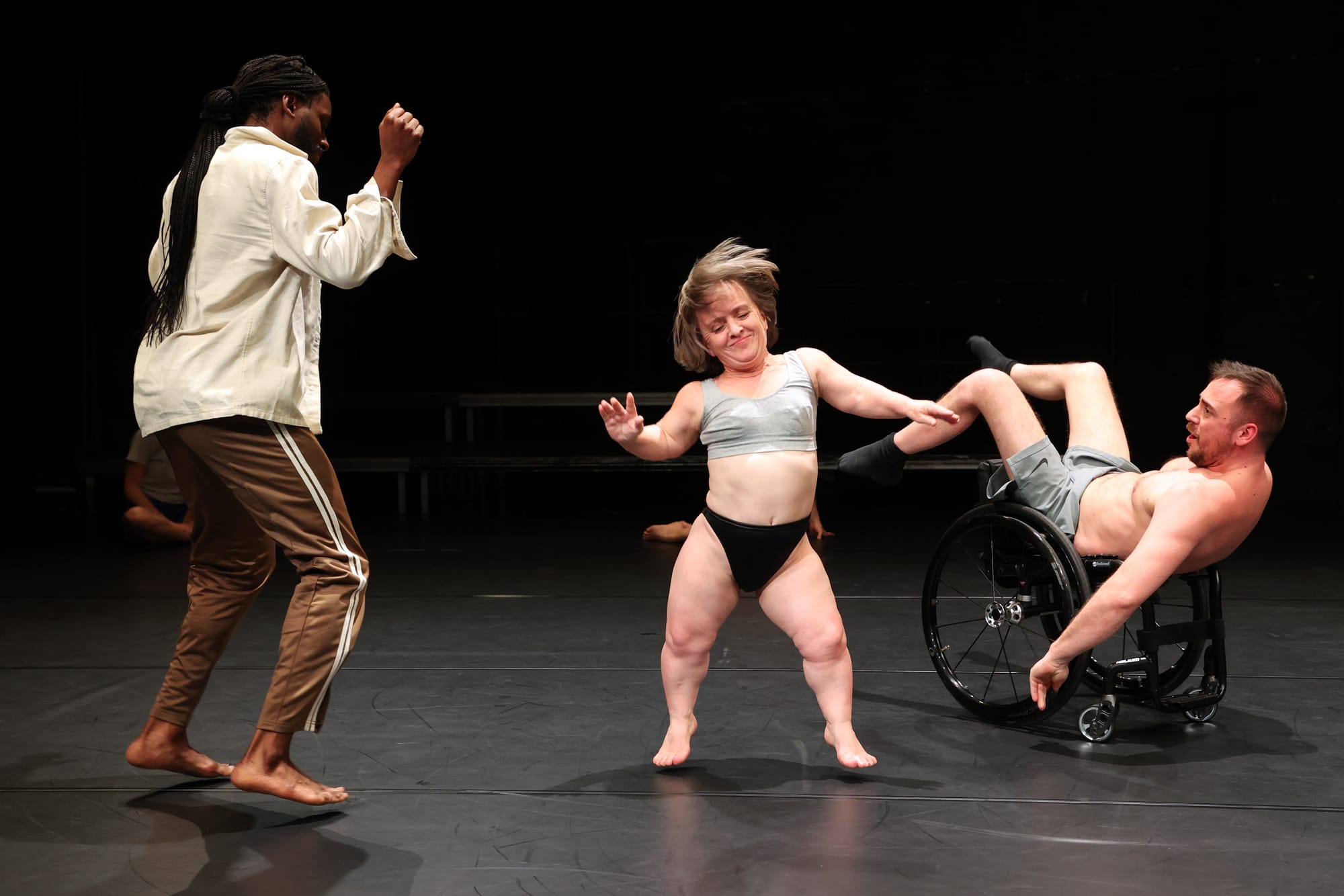 當身體之間開始呼應,節奏突然爆發成舞池般的能量場:舞者笑著跳、碰撞、旋轉,從寧靜的觀照到狂歡的共舞,觀眾不知不覺被捲入節奏裡。這不是秀場,而是一場誠實的「人類派對」—— 用動作消解偏見,用差異對話自由,挑戰舞蹈界對「完美身體」的既定認知。