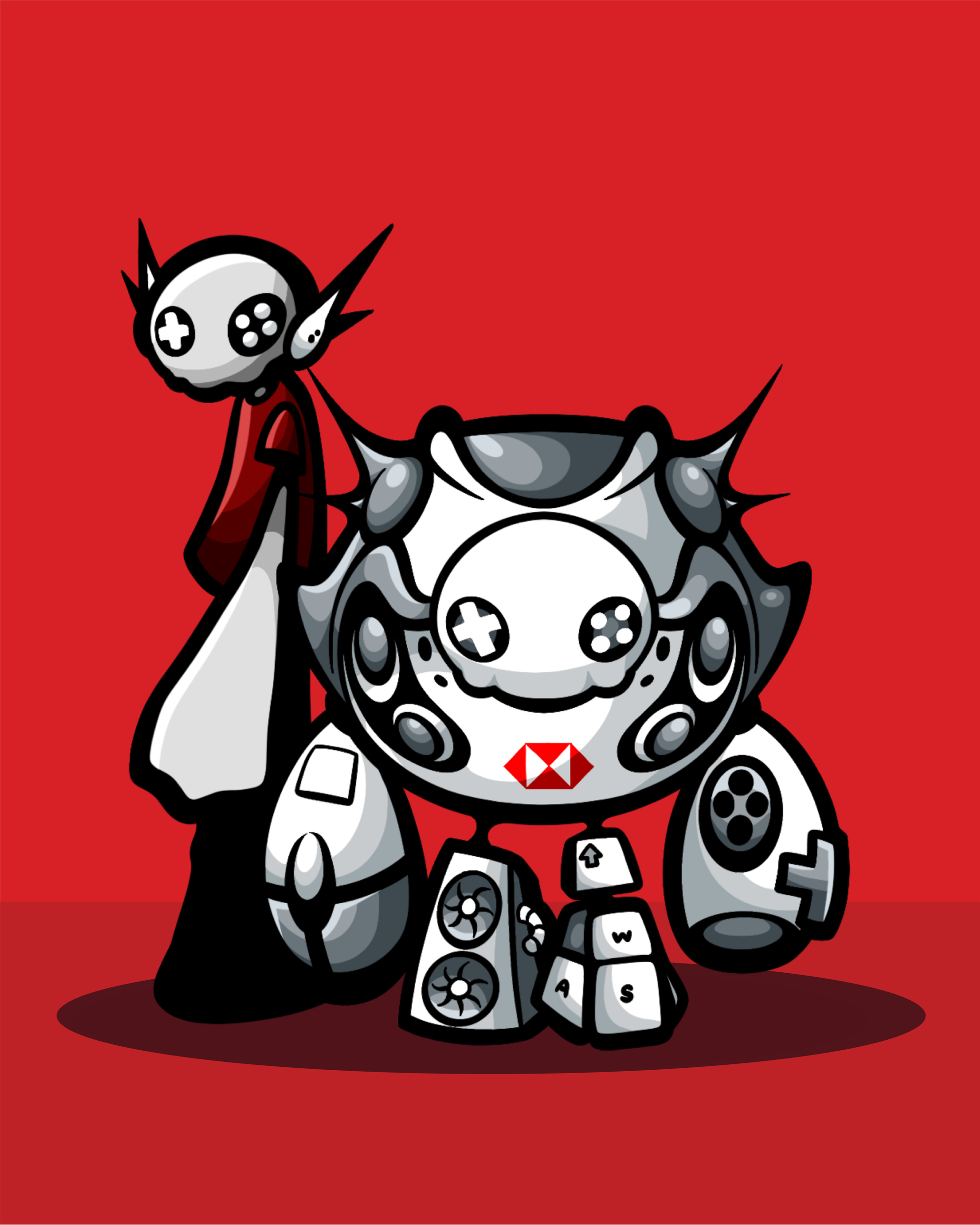 「在耳機掛飾、吊飾等3D作品中,大家會看到更多細節。例如它的眼睛設計模仿了遊戲機手掣,左眼在十字按鈕以外的位置是凹陷的,而右眼則沒有。它的左腿還有一個開關按鈕,腿部設計亦加入了更多機械元素;而印在工裝外套背面的2D設計中,我們在它的眼睛以外亦加入不少電競相關的元素,以滑鼠為手,散熱器和鍵盤作為雙腿。」在滙豐One Esports Zone中設置的3米高巨型雕塑,大家便可看到更多Machine Skull的細節。
