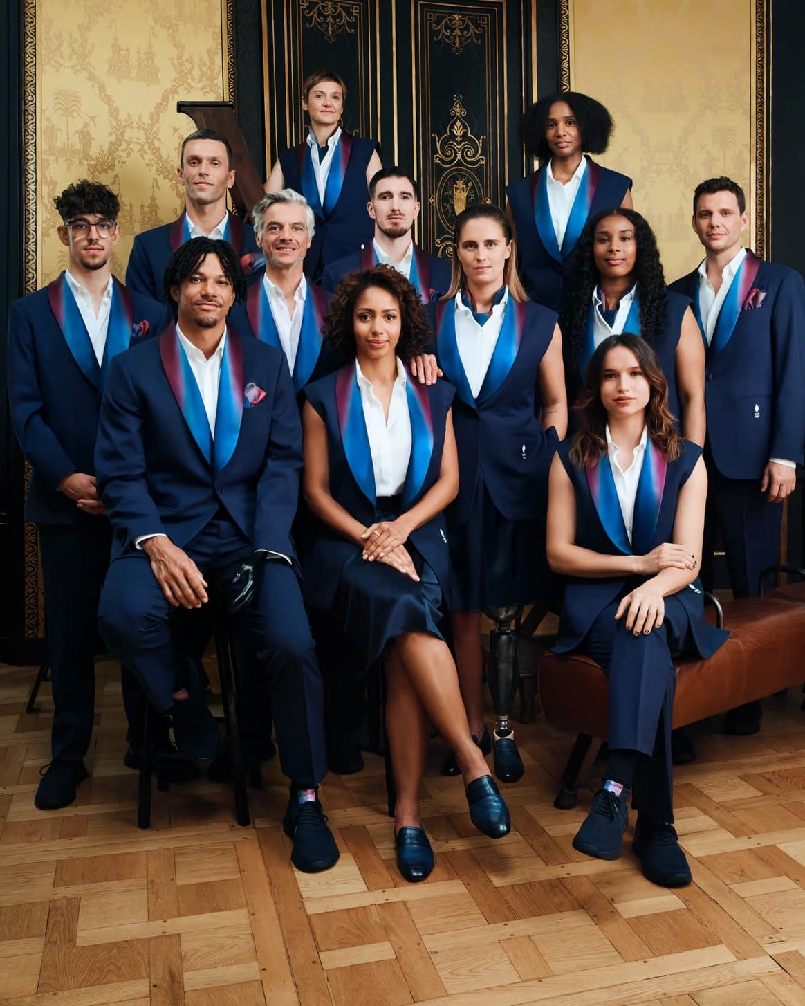 法國貴為今屆奧運的東道主;加上LVMH集團亦為運動會的贊助商,於是法國國家代表隊於開幕典禮的進場服,就再次找來Berluti合作。以優雅為大前提,運動員的進場西裝選以Midnight Blue色調,襯托上幻彩紅白藍三色「絲瓜領」細節。因為開幕禮運動員要站立一段頗長時間,於是Berluti又特別為正裝搭配了一款球鞋設計。而女運動員更可以揀選另一短裙款式,再襯一對loafer皮鞋。