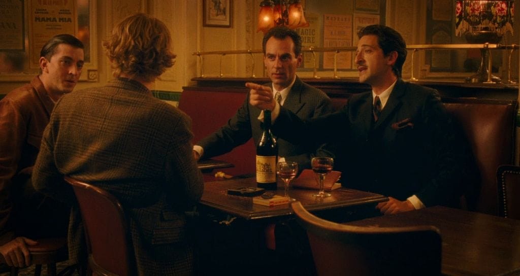 (左)《情迷午夜巴黎》的海明威(Corey Daniel Stoll飾);(右)三大超現實大師:Dali (Adrien Brody飾)、Man Ray(Tom Cordier飾)、Luis Buñuel(Adrien de Van飾)與男主角於Polidor餐廳同桌一幕,真正的超現實。