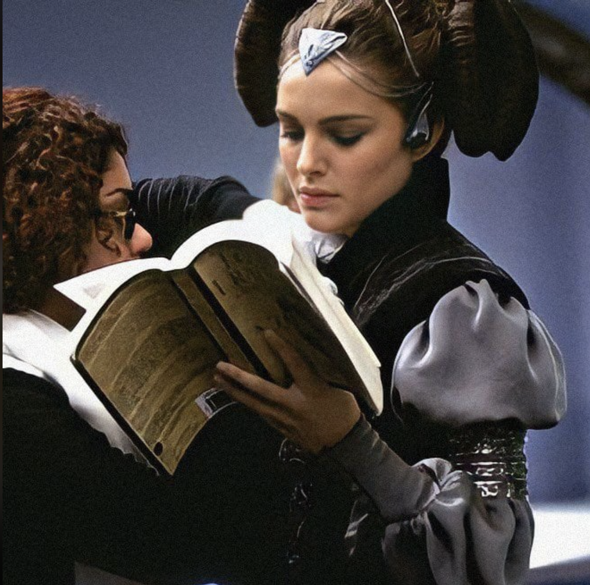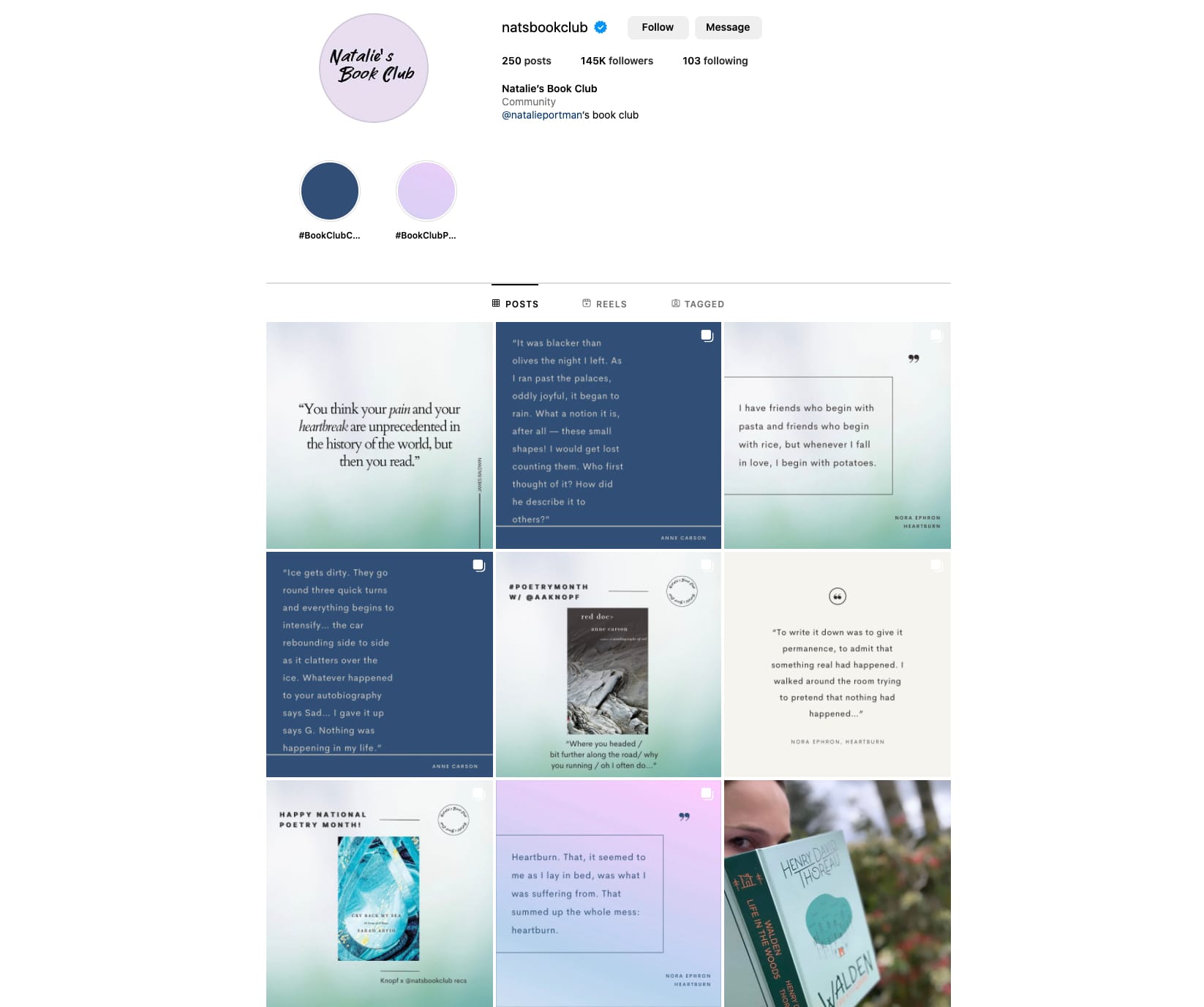 Natalie Portman即使在拍攝《Star Wars》期間也在讀書(左);Natalie Portman開設的讀書會專頁(右)