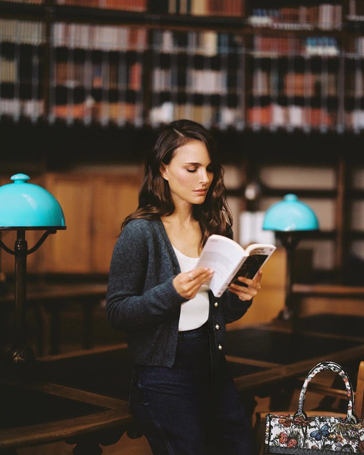 雖則這是為品牌而拍的廣告,可是Natalie Portman私底下確實有閱讀的習慣並會在自己的Instagram公開書單。她愛書愛得開設自己的讀書會專頁,差不多每個月都會讀一本書。她會邊讀邊在書頁間劃下喜歡的段落跟大家分享交流,最近便在讀美國作家Henry David Thoreau在林中簡樸生活而寫下的散文集《Walden: Life in the Woods》。
