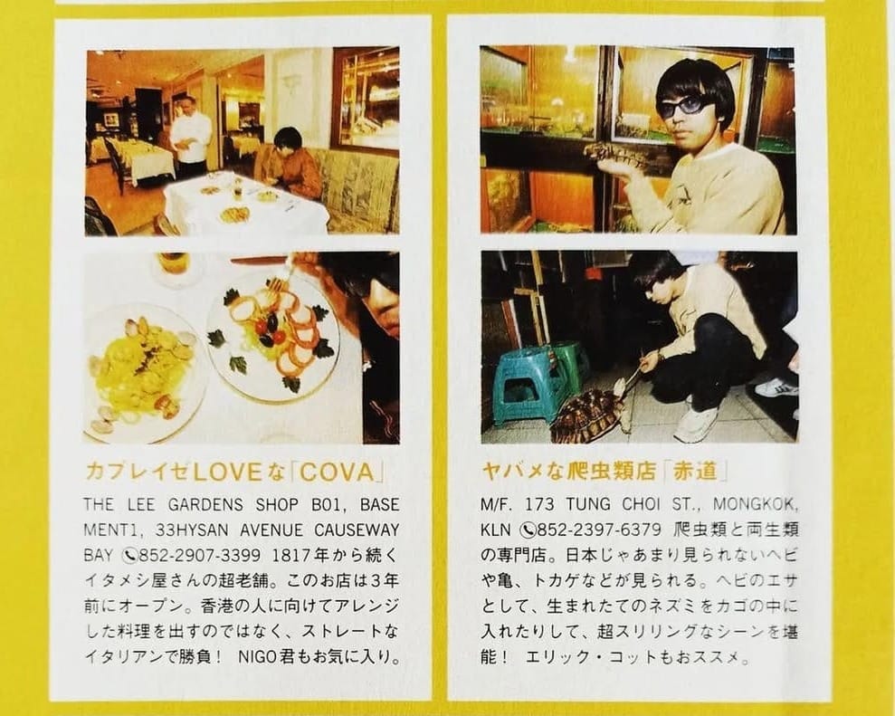 早在1999至2000年間,NIGO就曾到訪俗稱「金魚街」的太子通菜街,除了穿上現今價值不菲的美製古著衛衣,在這條鬧市中的「水族館」之間觀賞琳琅滿目的金魚和熱帶魚之外,還出手逗龜,更甚至用親手捧起蟒蛇合照,貼地感受香港此城獨有的都市叢林氣息。
