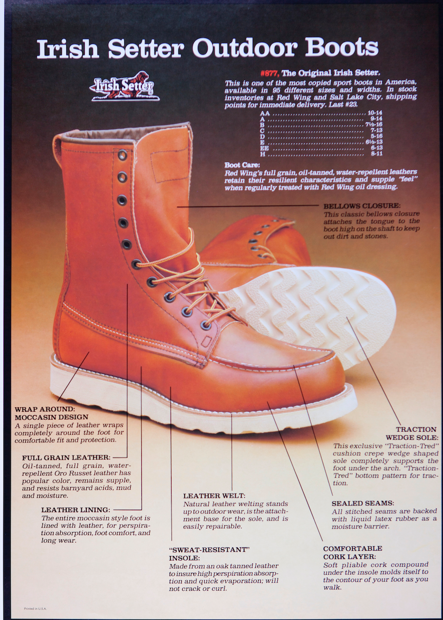 RED WING SHOES於50年代初推出狩獵靴系列#877 「Irish Setter」,特點是平底橡膠製鞋底,墊底緩衝功能極高。這有助獵人行走時減低聲音、在泥沼地帶行走時減低入泥,令狩獵更成功,當其時只有RED WING SHOES把這種鞋底用於男裝鞋。狩獵靴系列除了得到獵人大力推薦,更獲工人一致喜愛,特別是木匠和建築工人。