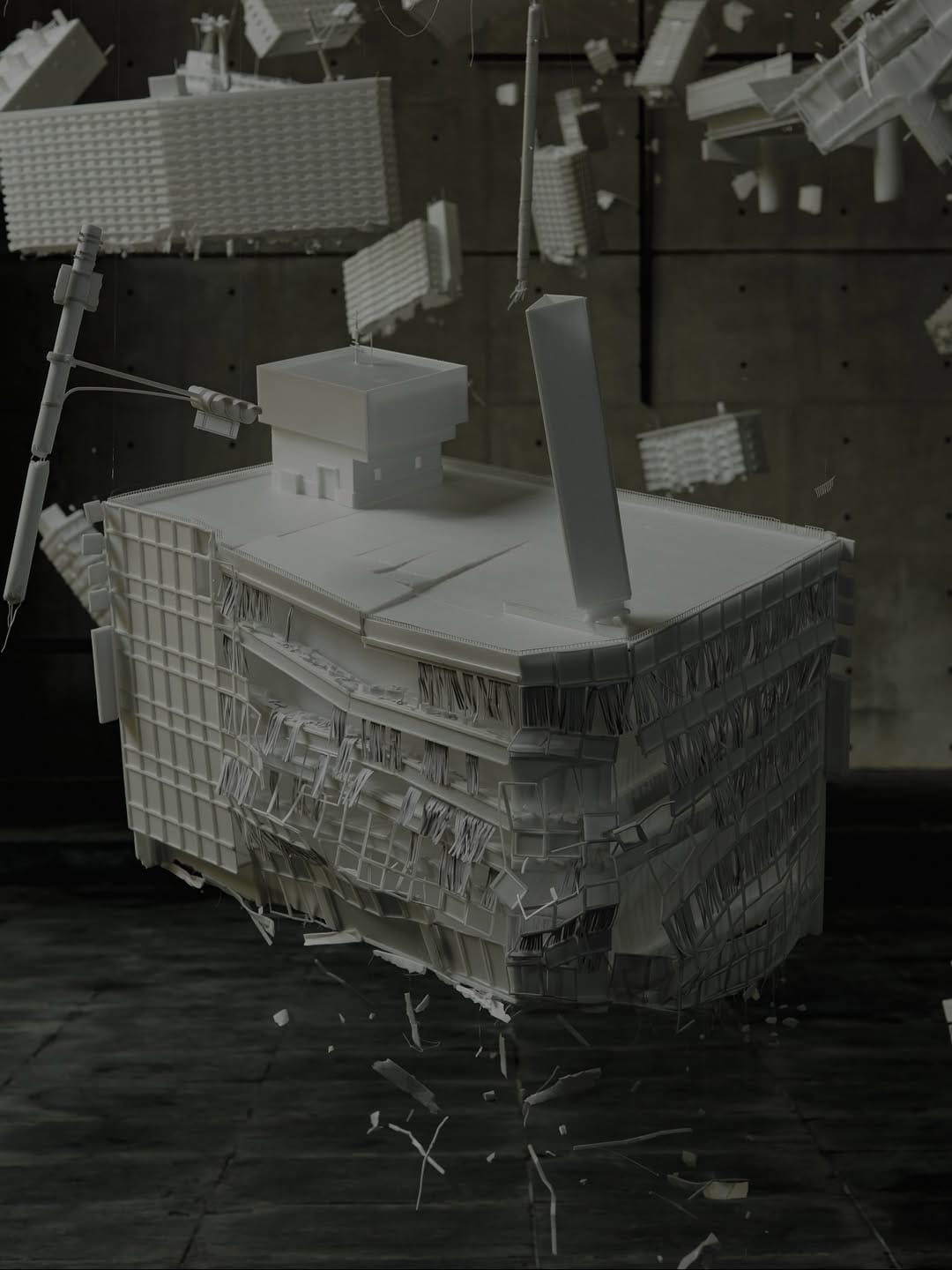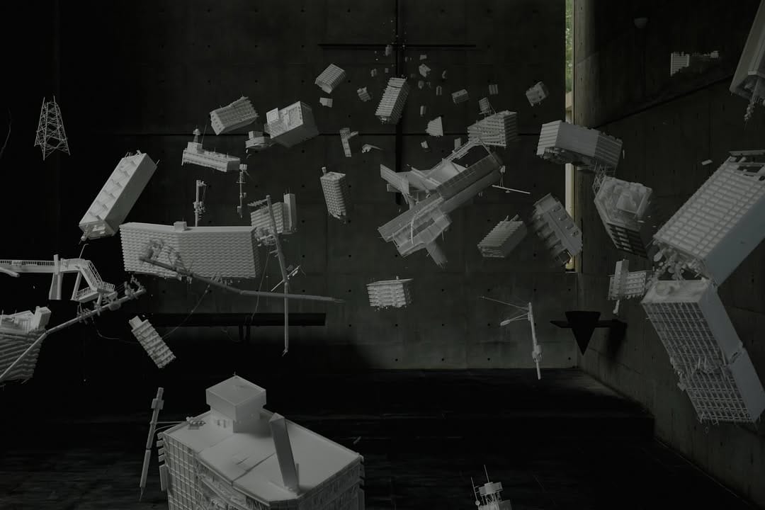 這並不是AI畫面,而是日本藝術家岩崎貴宏在神戸六甲ミーツ‧アート 2025 beyond帶來的新作《Floating Lanterns》。作品在安藤忠雄的「風之教堂」內展示,相當震撼。建築模型主要由在地震和戰爭中損毀的建築物組成,懸浮的碎片彷彿通通被吸進背後的十字架裡。