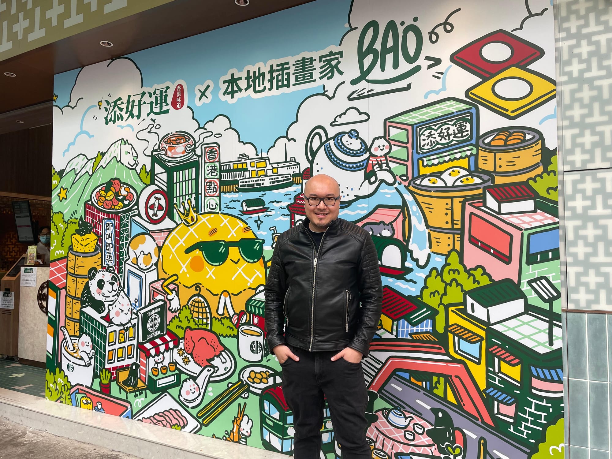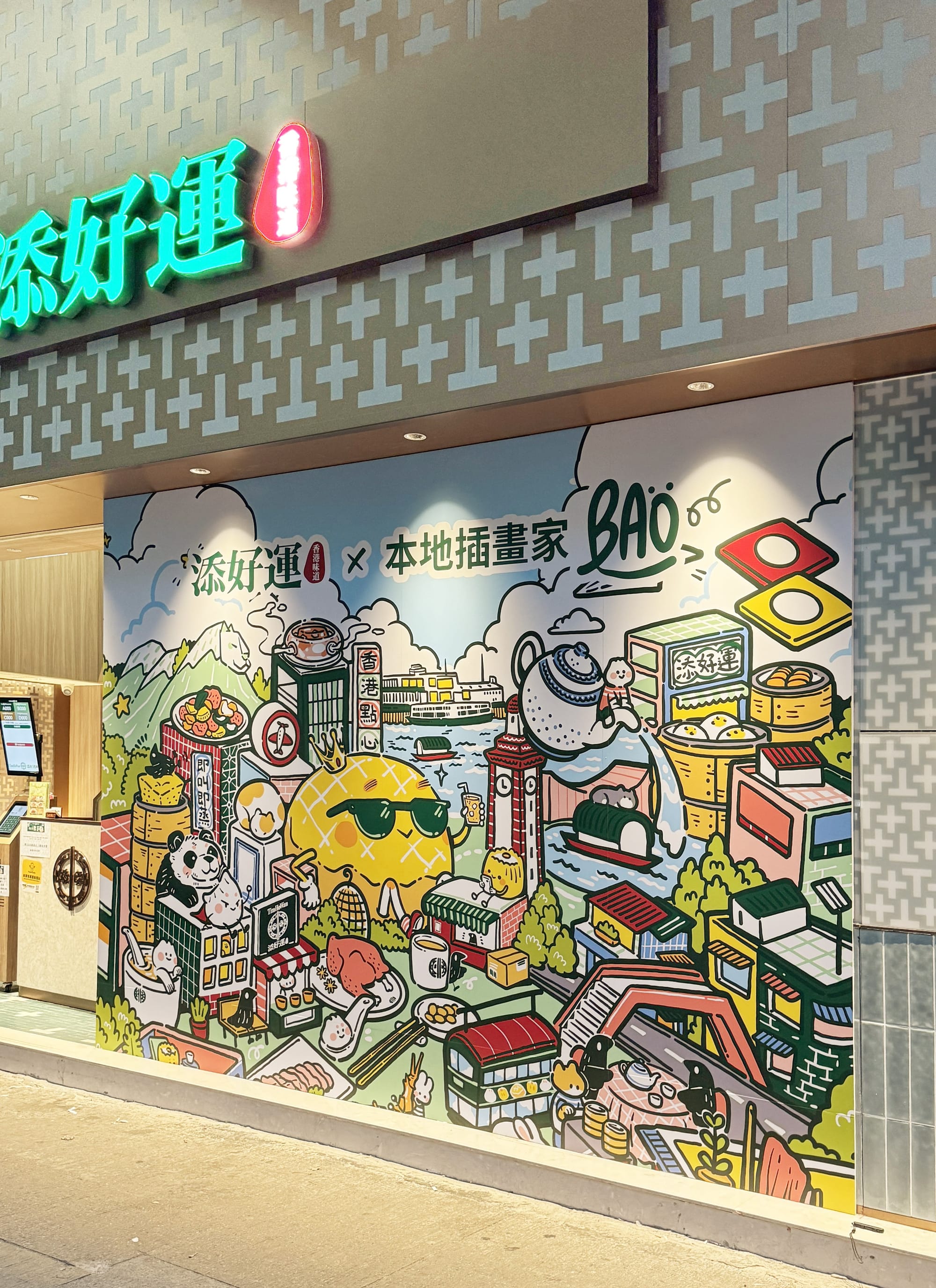 Bao Ho過去在香港不同角落創作Street Art,為這個城市增添童趣與異彩,看著大大幅的繪圖,總有令人放鬆心情的療癒效果。Bao擅長將日常生活中的人物及動物角色融入作品,今次跟添好運的合作,以「香港味道」為主題。她筆下的微縮版香港被點心包圍,又有添好運「叉燒包仔」及其他升級菜式融入香港的著名地標,如尖沙咀鐘樓、維多利亞港、獅子山等。細節部份如點心車、飛行棋、電車等代表香港的Icon亦活靈活現。