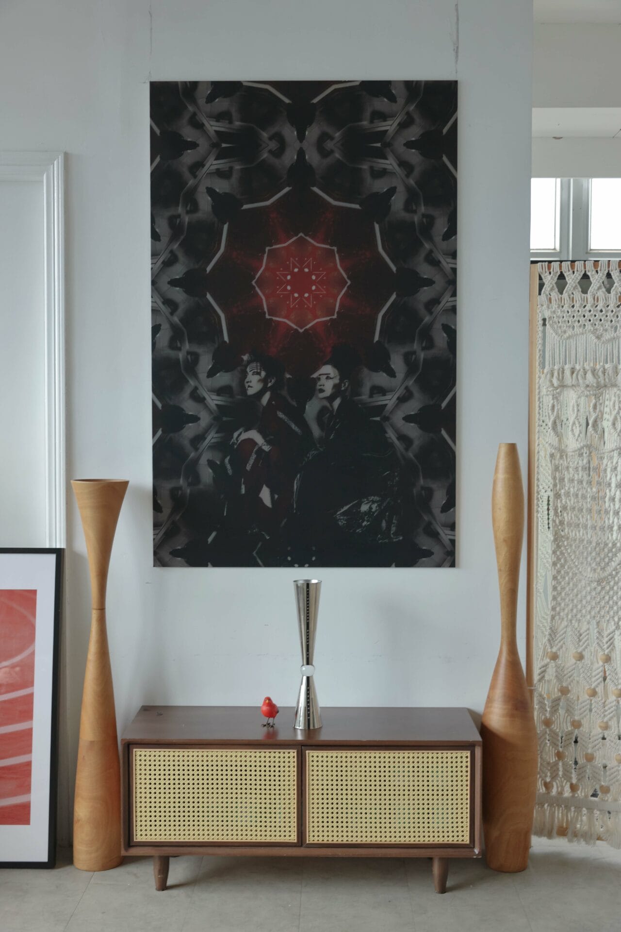 在她身後的畫作《Bloody Pool》便是當時其中一面作品。「我參加『Shibukaru Matsuri』是種緣份。在承諾參加之前,自己已著手《Village Vanguard》。當我回看,發覺自己確實受澀谷文化所影響,因為《Bloody Pool》的兩個主角,其實是滲透了澀谷的暴走族印象,所以不論衣服或是造形都有相當強烈的風格。」她解釋:「作品是講述兩個自以為型格的人,可毫無恐懼,然而已深陷如曼陀羅的血腥命運。它像個預言,因為現在每分每秒都充斥不同陷阱,不少人也因財損失。」