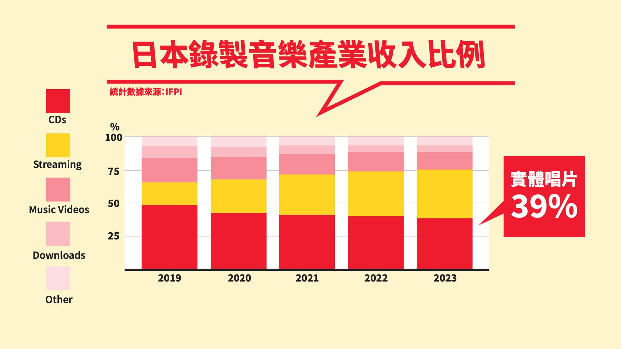 翻查IFPI的數據,日本於2023年實體唱片銷售收入,仍然佔錄製音樂產業收入39%,是當中最大比例。但當以全球市場整體計算,實體唱片銷售收入就只佔17.8%,相反串流佔最大比例接近七成收入,證明日本市場相比其他國家與地區,有著更大比例的實體音樂支持者。