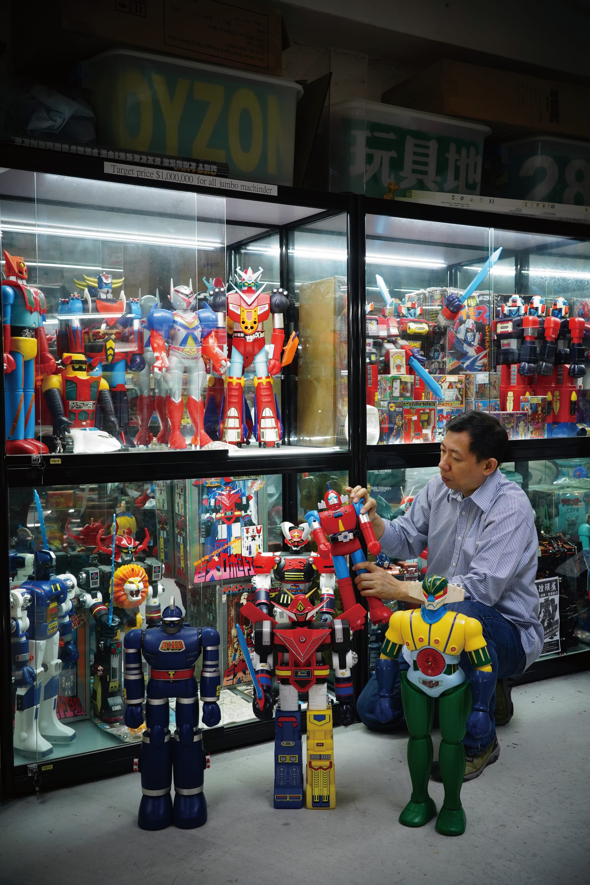 所謂的珍寶大膠,是指大型塑膠玩具,而主題離不開《鐵甲萬能俠》、《超力電磁俠》、《百獸王》等七至八十年代的機械人動畫,是合金玩具以外另一種機械人迷的收藏目標。「以前曾擁有《超時空要塞》的變形飛機、《鐵人28》、《太陽之子》BOX SET等合金玩具,但很多已放售了。自己本身對大件的東西較為感興趣,加上受《宇宙飛龍》、《宇宙大帝》等卡通影響,久而久之便沉迷下去,現時大概收藏七十多隻大膠。大膠不似其他玩具會持續出新款,總會有集齊的一天,否則便沒有心機收藏下去了。