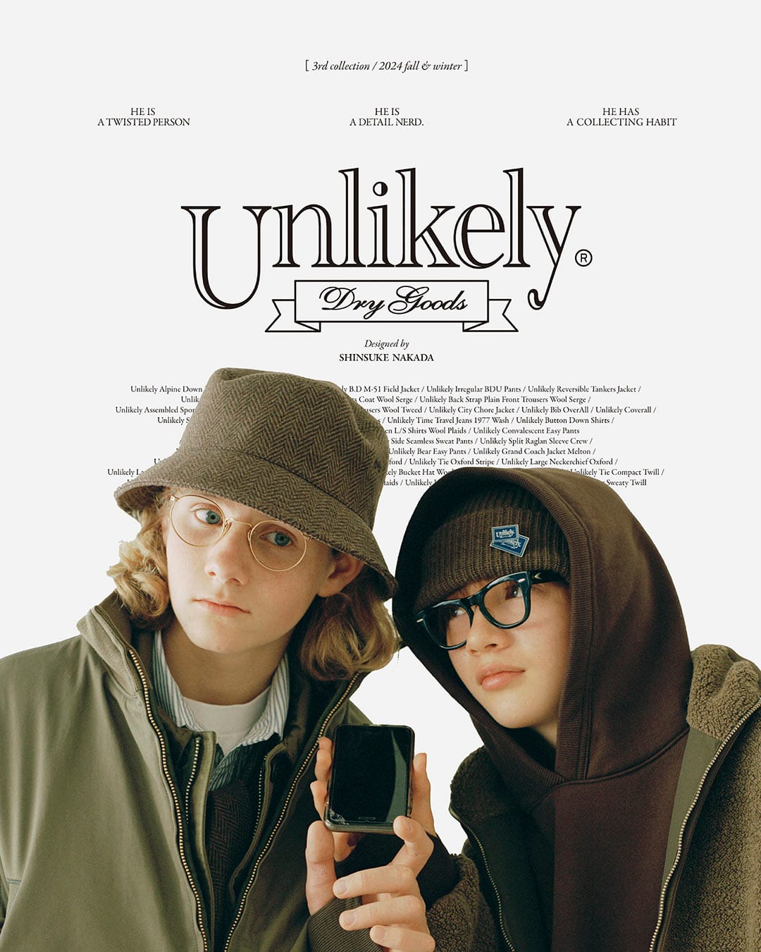 Unlikely Dry Goods推出至第三個季度,每一回都有強烈主題,變化雖大但風格統一,品牌很快便建立起自我形象。來到24-25AW季度,主題便以「He Has A Collecting Habit.He Is A Detail Nerd.He Is A Twisted Person」來發展,服飾就是為一個熱愛收藏又著重細節的偏執狂而設,活脫脫是中田先生的個人寫照。